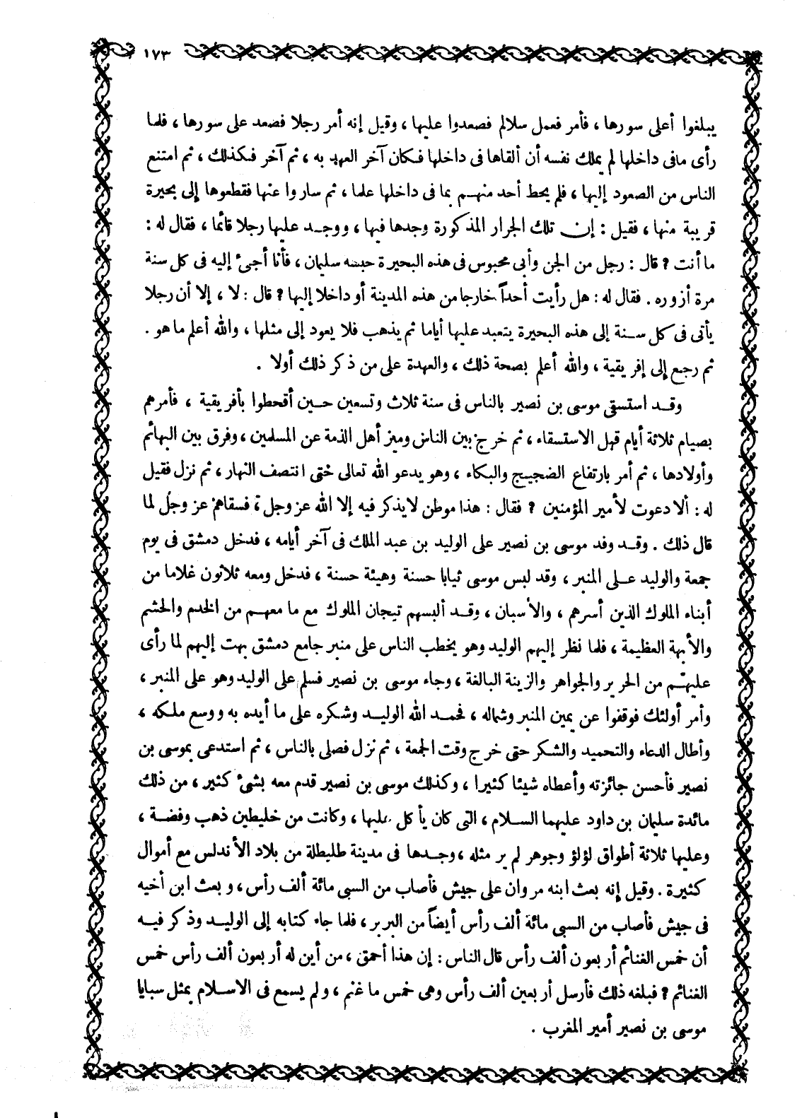 وَقَدِ اسْتَسْقَى مُوسَى بْنُ نُصَيْرٍ بِالنَّاسِ فِي سَنَةِ ثَلَاثٍ وَتِسْعِينَ حِينَ أَقْحَطُوا بِإِفْرِيقِيَّةَ، فَأَمَرَهُمْ بِصِيَامِ ثَلَاثَةِ أَيَّامٍ قَبْلَ الِاسْتِسْقَاءِ، ثُمَّ خَرَجَ بَيْنَ النَّاسِ وَمَيَّزَ أَهْلَ الذِّمَّةِ عَنِ الْمُسْلِمِينَ، وفرق بين البهائم وأولادها، ثم أمر بارتفاع الضَّجِيجِ وَالْبُكَاءِ، وَهُوَ يَدْعُو اللَّهَ تَعَالَى حَتَّى انْتَصَفَ النَّهَارُ، ثُمَّ نَزَلَ فَقِيلَ لَهُ: أَلَا دَعَوْتَ لِأَمِيرِ الْمُؤْمِنِينَ؟ فَقَالَ: هَذَا مَوْطِنٌ لَا يذكر فيه إلا الله عز وجل، فسقاهم عَزَّ وَجَلَّ لَمَّا قَالَ ذَلِكَ. وَقَدْ وَفَدَ مُوسَى بْنُ نُصَيْرٍ عَلَى الْوَلِيدِ بْنِ عَبْدِ الْمَلِكِ فِي آخِرِ أَيَّامِهِ، فَدَخَلَ دِمَشْقَ فِي يَوْمِ جُمُعَةٍ وَالْوَلِيدُ عَلَى الْمِنْبَرِ، وَقَدْ لَبِسَ موسى ثيابا حسنة وهيئة حسنة، فدخل ومعه ثلاثون غلاما من أبناء الملوك الذين أسرهم، والإسبان، وَقَدْ أَلْبَسَهُمْ تِيجَانَ الْمُلُوكِ مَعَ مَا مَعَهُمْ مِنَ الْخَدَمِ وَالْحَشَمِ وَالْأُبَّهَةِ الْعَظِيمَةِ، فَلَمَّا نَظَرَ إِلَيْهِمْ الْوَلِيدُ وَهُوَ يَخْطُبُ النَّاسَ عَلَى مِنْبَرِ جَامِعِ دِمَشْقَ بُهِتَ إِلَيْهِمْ لِمَا رَأَى عَلَيْهِمْ مِنَ الْحَرِيرِ وَالْجَوَاهِرِ وَالزِّينَةِ الْبَالِغَةِ، وَجَاءَ مُوسَى بْنُ نُصَيْرٍ فَسَلَّمَ عَلَى الْوَلِيدِ وَهُوَ عَلَى الْمِنْبَرِ، وَأَمَرَ أُولَئِكَ فَوَقَفُوا عَنْ يَمِينِ الْمِنْبَرِ وَشِمَالِهِ، فَحَمِدَ اللَّهَ الْوَلِيدُ وَشَكَرَهُ عَلَى مَا أَيَّدَهُ بِهِ وَوَسَّعَ مُلْكَهُ، وَأَطَالَ الدُّعَاءَ وَالتَّحْمِيدَ وَالشُّكْرَ حَتَّى خَرَجَ وَقْتُ الْجُمُعَةِ، ثُمَّ نَزَلَ فَصَلَّى بِالنَّاسِ، ثُمَّ اسْتَدْعَى بِمُوسَى بْنِ نُصَيْرٍ فأحسن جائزته وأعطاه شيئا كثيرا، وكذلك موسى بن نصير قدم معه بشيء كثير، من ذلك مائدة سُلَيْمَانَ بْنِ دَاوُدَ عَلَيْهِمَا السَّلَامُ، الَّتِي كَانَ يَأْكُلُ عَلَيْهَا، وَكَانَتْ مِنْ خَلِيطَيْنِ ذَهَبٍ وَفِضَّةٍ، وَعَلَيْهَا ثَلَاثَةُ أَطْوَاقِ لُؤْلُؤٍ وَجَوْهَرٍ لَمْ يُرَ مثله، وَجَدَهَا فِي مَدِينَةِ طُلَيْطِلَةَ مِنْ بِلَادِ الْأَنْدَلُسِ مَعَ أَمْوَالٍ كَثِيرَةٍ. وَقِيلَ إِنَّهُ بَعَثَ ابْنَهُ مَرْوَانَ عَلَى جَيْشٍ فَأَصَابَ مِنَ السَّبْيِ مِائَةَ أَلْفِ رَأْسٍ، وَبَعَثَ ابْنَ أَخِيهِ فِي جَيْشٍ فأصاب من السبي مِائَةَ أَلْفِ رَأْسٍ أَيْضًا مِنَ الْبَرْبَرِ، فَلَمَّا جَاءَ كِتَابُهُ إِلَى الْوَلِيدِ وَذَكَرَ فِيهِ أَنَّ خُمُسَ الْغَنَائِمِ أَرْبَعُونَ أَلْفَ رَأْسٍ قَالَ النَّاسُ: إِنَّ هَذَا أَحْمَقُ، مِنْ أَيْنَ لَهُ أَرْبَعُونَ أَلْفَ رَأْسٍ خُمُسُ الْغَنَائِمِ؟ فَبَلَغَهُ ذَلِكَ فَأَرْسَلَ أَرْبَعِينَ أَلْفَ رَأْسٍ وَهِيَ خُمُسُ مَا غَنِمَ، وَلَمْ يُسْمَعْ فِي الْإِسْلَامِ بِمِثْلِ سَبَايَا مُوسَى بْنِ نُصَيْرٍ أَمِيرِ الْمَغْرِبِ.