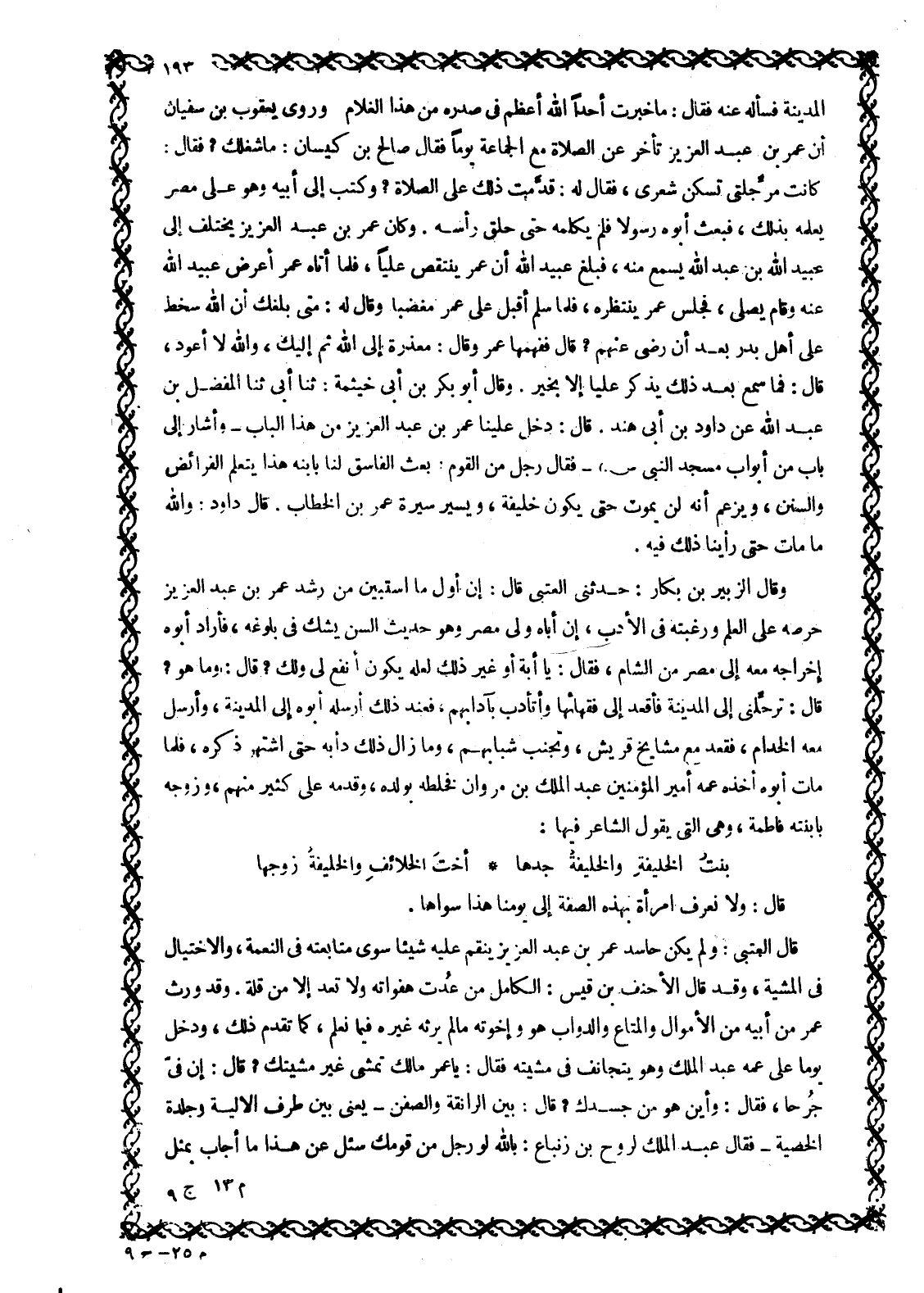 كَانَتْ مُرَجِّلَتِي تُسَكِّنُ شَعْرِي، فَقَالَ لَهُ: قدّمت ذَلِكَ عَلَى الصَّلَاةِ؟ وَكَتَبَ إِلَى أَبِيهِ وَهُوَ عَلَى مِصْرَ يُعْلِمُهُ بِذَلِكَ، فَبَعَثَ أَبُوهُ رَسُولًا فَلَمْ يُكَلِّمْهُ حَتَّى حَلَقَ رَأْسَهُ. وَكَانَ عُمَرُ بْنُ عَبْدِ الْعَزِيزِ يَخْتَلِفُ إِلَى عُبَيْدِ اللَّهِ بْنِ عَبْدِ اللَّهِ يَسْمَعُ مِنْهُ، فَبَلَغَ عُبَيْدَ اللَّهِ أَنَّ عُمَرَ يَنْتَقِصُ عَلِيًّا، فَلَمَّا أَتَاهُ عُمَرُ أَعْرَضَ عُبَيْدُ اللَّهِ عَنْهُ وَقَامَ يُصَلِّي، فَجَلَسَ عُمَرُ يَنْتَظِرُهُ، فَلَمَّا سَلَّمَ أَقْبَلَ عَلَى عُمَرَ مُغْضَبًا وَقَالَ لَهُ: مَتَى بَلَغَكَ أَنَّ اللَّهَ سَخِطَ عَلَى أَهْلِ بَدْرٍ بَعْدَ أَنْ رَضِيَ عَنْهُمْ؟ قَالَ فَفَهِمَهَا عُمَرُ وَقَالَ: مَعْذِرَةً إِلَى اللَّهِ ثُمَّ إِلَيْكَ، وَاللَّهِ لَا أَعُودُ، قَالَ: فَمَا سُمِعَ بَعْدَ ذَلِكَ يَذْكُرُ عَلِيًّا إِلَّا بِخَيْرٍ. وَقَالَ أَبُو بَكْرِ بْنُ أَبِي خَيْثَمَةَ: ثَنَا أَبِي ثَنَا الْمُفَضَّلُ بْنُ عَبْدِ اللَّهِ عَنْ دَاوُدَ بْنِ أَبِي هِنْدٍ. قَالَ: دَخَلَ عَلَيْنَا عُمَرُ بْنُ عَبْدِ الْعَزِيزِ مِنْ هذا الباب- وأشار إلى باب مِنْ أَبْوَابِ مَسْجِدِ النَّبِيِّ صَلَّى اللَّهُ عَلَيْهِ وَسَلَّمَ- فَقَالَ رَجُلٌ مِنْ القوم: بعث الفاسق لنا بِابْنِهِ هَذَا يَتَعَلَّمُ الْفَرَائِضَ وَالسُّنَنَ، وَيَزْعُمُ أَنَّهُ لن يموت حتى يكون خليفة، ويسير سيرة عمر بن الخطاب. قال داود: والله مَا مَاتَ حَتَّى رَأَيْنَا ذَلِكَ فِيهِ.