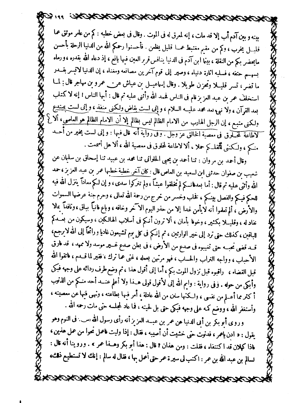 بَيْنَهُ وَبَيْنَ آدَمَ أَبٌ إِلَّا قَدْ مَاتَ، إِنَّهُ لَمُعْرَقٌ لَهُ فِي الْمَوْتِ. وَقَالَ فِي بعض خطبه: كم من عامر موثق عَمَّا قَلِيلٍ يَخْرُبُ، وَكَمْ مِنْ مُقِيمٍ مُغْتَبِطٍ عَمَّا قَلِيلٍ يَظْعَنُ. فَأَحْسِنُوا رَحِمَكُمُ اللَّهُ مِنَ الدنيا الرحلة بأحسن ما يحضر بكم مِنَ النَّقْلَةِ، بَيْنَمَا ابْنُ آدَمَ فِي الدُّنْيَا ينافس قرير العين فيها يانع، إذ دعاه الله بقدره، ورماه بسهم حتفه، فسلبه اثارة دنياه، وصير إلى قوم آخَرِينَ مَصَانِعَهُ وَمَغْنَاهُ، إِنَّ الدُّنْيَا لَا تَسُرُّ بِقَدْرِ مَا تَضُرُّ، تَسُرُّ قَلِيلًا وَتُحْزِنُ طَوِيلًا: وَقَالَ إِسْمَاعِيلُ بْنُ عَيَّاشٍ عَنْ عَمْرِو بْنِ مُهَاجِرٍ قَالَ: لَمَّا اسْتُخْلِفَ عُمَرُ بْنُ عَبْدِ الْعَزِيزِ قَامَ فِي النَّاسِ فَحَمِدَ اللَّهَ وَأَثْنَى عَلَيْهِ ثُمَّ قَالَ: أَيُّهَا النَّاسُ! إِنَّهُ لَا كِتَابَ بَعْدَ الْقُرْآنِ، وَلَا نَبِيَّ بَعْدَ مُحَمَّدٍ عَلَيْهِ السَّلَامُ، وَإِنِّي لَسْتُ بِقَاضٍ وَلَكِنِّي مُنْفِذٌ، وَإِنِّي لَسْتُ بِمُبْتَدِعٍ وَلَكِنِّي مُتَّبِعٌ، إِنَّ الرَّجُلَ الْهَارِبَ مِنَ الْإِمَامِ الظَّالِمِ لَيْسَ بِظَالِمٍ أَلَا إِنَّ الْإِمَامَ الظَّالِمَ هُوَ الْعَاصِي، أَلَا لَا طَاعَةَ لِمَخْلُوقٍ فِي مَعْصِيَةِ الْخَالِقِ عَزَّ وَجَلَّ. وَفِي رِوَايَةٍ أَنَّهُ قَالَ فِيهَا: وَإِنِّي لَسْتُ بخير من أحد منكم، ولكنني أَثْقَلُكُمْ حِمْلًا، أَلَا لَا طَاعَةَ لِمَخْلُوقٍ فِي مَعْصِيَةِ اللَّهِ، أَلَا هَلْ أَسْمَعْتُ.