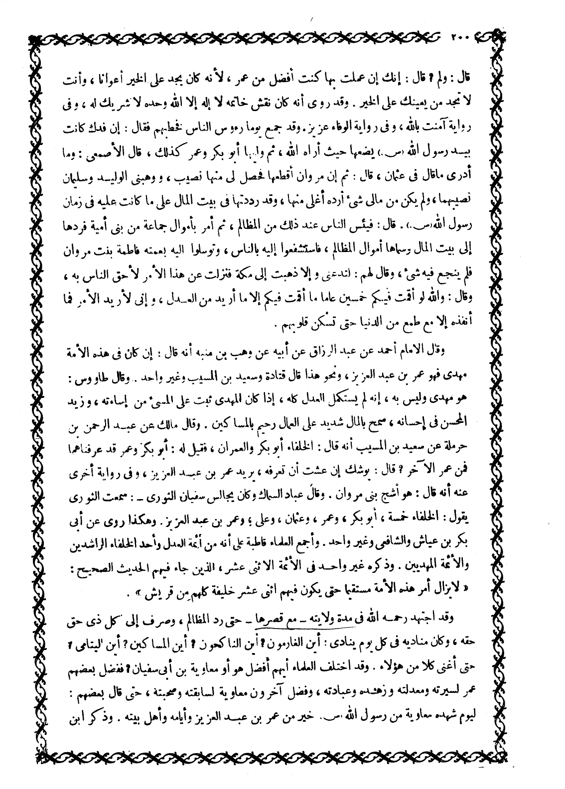 هُوَ مَهْدِيٌّ وَلَيْسَ بِهِ، إِنَّهُ لَمْ يَسْتَكْمِلِ العدل كله، إذا كان المهدي ثبت عَلَى الْمُسِيءِ مِنْ إِسَاءَتِهِ، وَزِيدَ الْمُحْسِنُ فِي إِحْسَانِهِ، سَمْحٌ بِالْمَالِ شَدِيدٌ عَلَى الْعُمَّالِ رَحِيمٌ بِالْمَسَاكِينِ. وَقَالَ مَالِكٌ عَنْ عَبْدِ الرَّحْمَنِ بْنِ حَرْمَلَةَ عَنْ سَعِيدِ بْنِ الْمُسَيِّبِ أَنَّهُ قَالَ: الْخُلَفَاءُ أَبُو بَكْرٍ وَالْعُمَرَانِ، فَقِيلَ لَهُ: أَبُو بَكْرٍ وَعُمَرُ قَدْ عَرَفْنَاهُمَا فَمَنْ عُمَرُ الْآخَرُ؟ قَالَ: يُوشِكُ إِنْ عِشْتَ أَنْ تَعْرِفَهُ، يُرِيدُ عُمَرَ بْنَ عَبْدِ الْعَزِيزِ، وَفِي رِوَايَةٍ أُخْرَى عَنْهُ أَنَّهُ قَالَ: هُوَ أَشَجُّ بَنِي مَرْوَانَ. وَقَالَ عَبَّادٌ السَّمَّاكُ وَكَانَ يُجَالِسُ سُفْيَانَ الثَّوْرِيَّ-: سَمِعْتُ الثَّوْرِيَّ يَقُولُ: الْخُلَفَاءُ خَمْسَةٌ، أَبُو بَكْرٍ، وَعُمَرُ، وَعُثْمَانُ، وَعَلِيٌّ، وَعُمَرُ بْنُ عَبْدِ الْعَزِيزِ. وَهَكَذَا رُوِيَ عَنْ أَبِي بَكْرِ بْنِ عَيَّاشٍ وَالشَّافِعِيِّ وَغَيْرِ وَاحِدٍ. وَأَجْمَعَ الْعُلَمَاءُ قَاطِبَةً عَلَى أَنَّهُ مِنْ أَئِمَّةِ الْعَدْلِ وَأَحَدِ الْخُلَفَاءِ الرَّاشِدِينَ وَالْأَئِمَّةِ الْمَهْدِيِّينَ. وَذَكَرَهُ غَيْرُ وَاحِدٍ فِي الْأَئِمَّةِ الِاثْنَيْ عَشَرَ، الَّذِينَ جَاءَ فِيهِمُ الْحَدِيثُ الصَّحِيحُ: