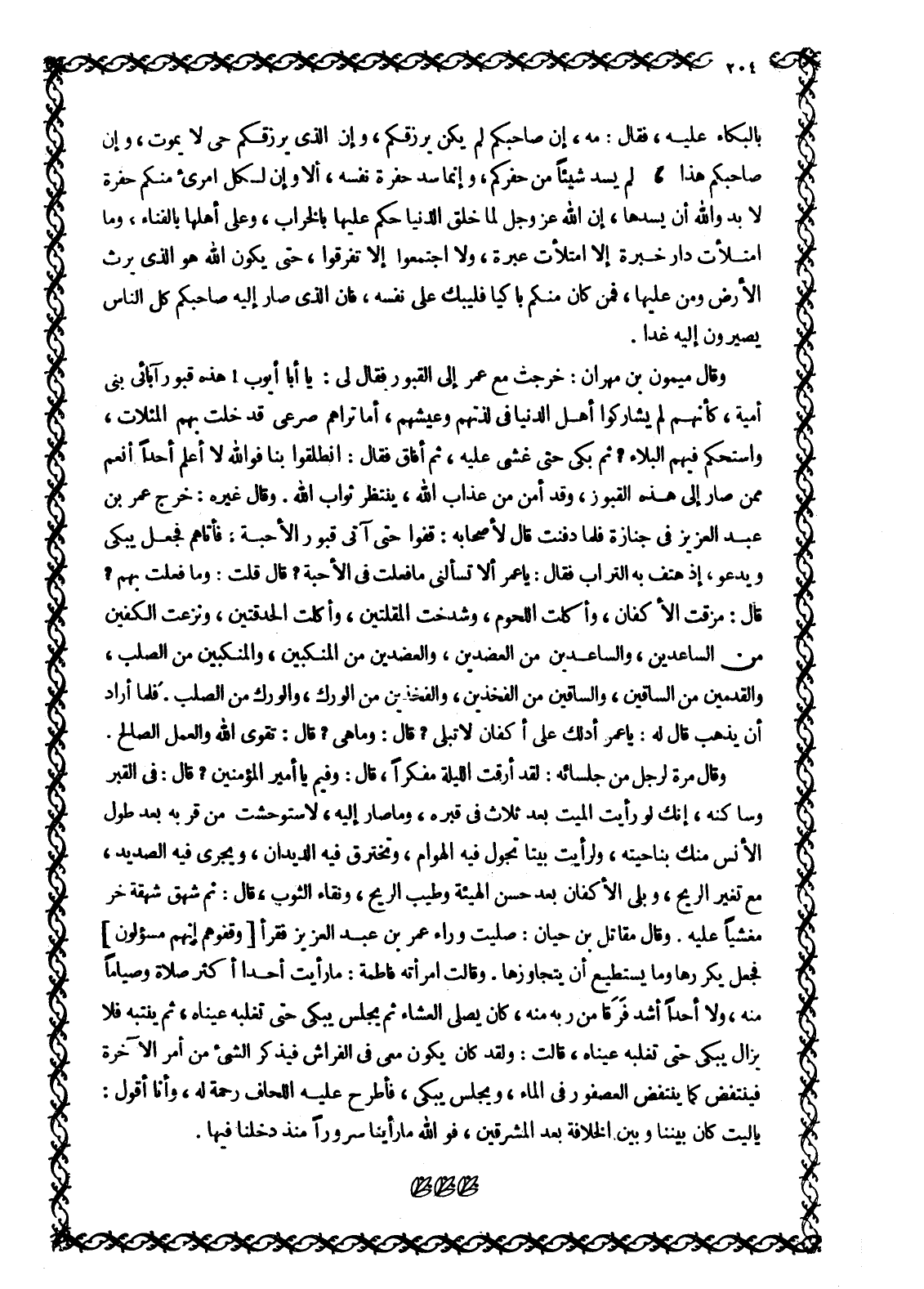 وَقَالَ مَيْمُونُ بْنُ مِهْرَانَ: خَرَجْتُ مَعَ عُمَرَ إِلَى الْقُبُورِ فَقَالَ لِي: يَا أَبَا أَيُّوبَ! هَذِهِ قُبُورُ آبَائِي بَنِي أُمَيَّةَ، كَأَنَّهُمْ لَمْ يُشَارِكُوا أَهْلَ الدُّنْيَا فِي لَذَّتِهِمْ وعيشهم، أما تراهم صرعى قد خلت بهم الْمَثُلَاتُ، وَاسْتَحْكَمَ فِيهِمُ الْبَلَاءُ؟ ثُمَّ بَكَى حَتَّى غُشِيَ عَلَيْهِ، ثُمَّ أَفَاقَ فَقَالَ: انْطَلِقُوا بِنَا فو الله لَا أَعْلَمُ أَحَدًا أَنْعَمَ مِمَّنْ صَارَ إِلَى هَذِهِ الْقُبُورِ، وَقَدْ أَمِنَ مِنْ عَذَابِ اللَّهِ، ينتظر ثواب اللَّهِ. وَقَالَ غَيْرُهُ: خَرَجَ عُمَرُ بْنُ عَبْدِ الْعَزِيزِ فِي جِنَازَةٍ فَلَمَّا دُفِنَتْ قَالَ لِأَصْحَابِهِ: قِفُوا حَتَّى آتِيَ قُبُورَ الْأَحِبَّةِ، فَأَتَاهُمْ فَجَعَلَ يَبْكِي وَيَدْعُو، إِذْ هَتَفَ بِهِ التُّرَابُ فَقَالَ: يَا عُمَرُ أَلَا تَسْأَلُنِي مَا فَعَلْتُ فِي الْأَحِبَّةِ؟ قَالَ قُلْتُ: وَمَا فَعَلْتَ بِهِمْ؟