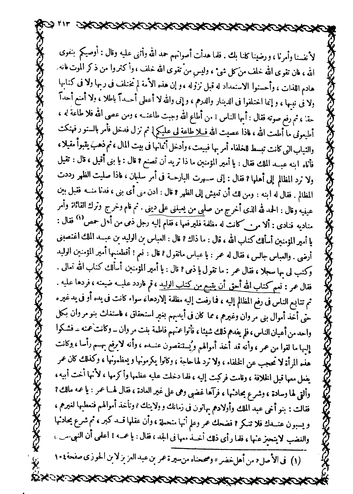 يا أمير المؤمنين أسألك كتاب الله، قال: ما ذاك؟ قال: العباس بن الوليد بن عبد الملك اغتصبنى أرضى. والعباس جالس، فقال له عمر: يا عباس ما تقول؟ قال: نعم! أقطعنيها أمير المؤمنين الوليد وكتب لي بها سجلا، فقال عمر: ما تقول يا ذمي؟ قال: يا أمير المؤمنين أسألك كتاب الله تعالى.