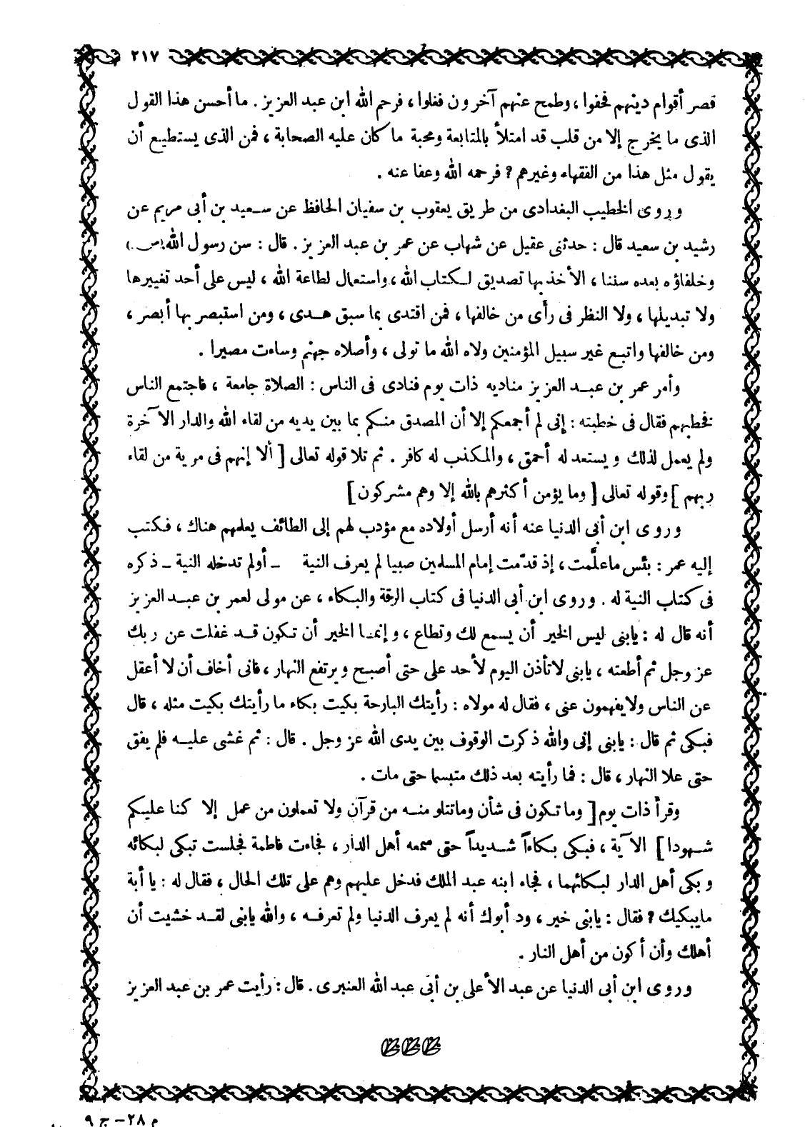 وروى ابن أبى الدنيا عن عبد الأعلى بن أبى عبد الله العنبري. قال: رأيت عمر بن عبد العزيز