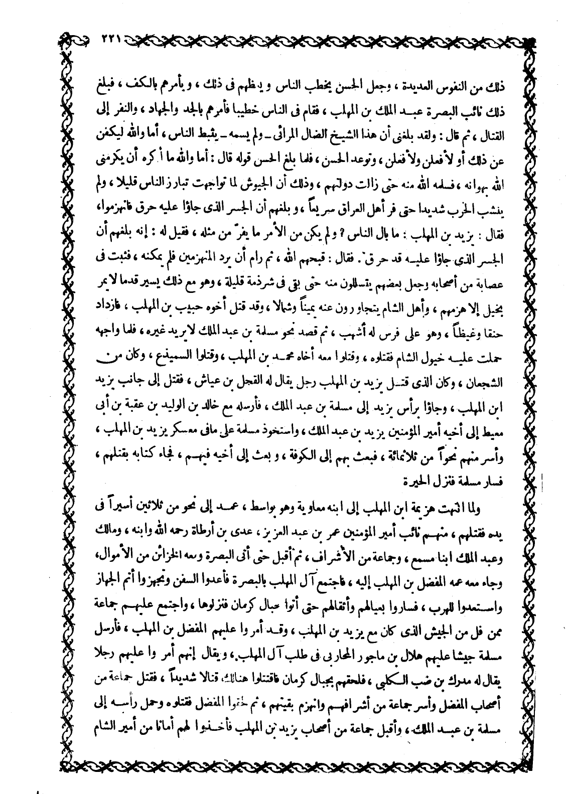 ذَلِكَ مِنَ النُّفُوسِ الْعَدِيدَةِ، وَجَعَلَ الْحَسَنُ يَخْطُبُ الناس ويعظهم في ذلك، ويأمرهم بالكف، فبلغ ذلك نائب البصرة عبد الملك بْنَ الْمُهَلَّبِ، فَقَامَ فِي النَّاسِ خَطِيبًا فَأَمَرَهُمْ بالجد والجهاد، والنفر إِلَى الْقِتَالِ، ثُمَّ قَالَ: وَلَقَدْ بَلَغَنِي أَنَّ هَذَا الشَّيْخَ الضَّالَّ الْمُرَائِيَ- وَلَمْ يُسَمِّهِ- يُثَبِّطُ الناس، أَمَا وَاللَّهِ لَيَكُفَنَّ عَنْ ذَلِكَ أَوْ لَأَفْعَلَنَّ وَلَأَفْعَلَنَّ، وَتَوَعَّدَ الْحَسَنَ، فَلَمَّا بَلَغَ الْحَسَنَ قَوْلُهُ قَالَ: أَمَا وَاللَّهِ مَا أَكْرَهُ أَنْ يُكْرِمَنِي اللَّهُ بِهَوَانِهِ، فَسَلَّمَهُ اللَّهُ مِنْهُ حَتَّى زَالَتْ دَوْلَتُهُمْ، وَذَلِكَ أَنَّ الْجُيُوشَ لَمَّا تَوَاجَهَتْ تَبَارَزَ الناس قليلا، ولم ينشب الحرب شديدا حتى فر أهل العراق سَرِيعًا، وَبَلَغَهُمْ أَنَّ الْجِسْرَ الَّذِي جَاءُوا عَلَيْهِ حُرِقَ فَانْهَزَمُوا، فَقَالَ: يَزِيدُ بْنُ الْمُهَلَّبِ: مَا بَالُ النَّاسِ؟ وَلَمْ يَكُنْ مِنَ الْأَمْرِ مَا يُفَرُّ مِنْ مِثْلِهِ، فَقِيلَ لَهُ: إِنَّهُ بَلَغَهُمْ أَنَّ الْجِسْرَ الَّذِي جَاءُوا عَلَيْهِ قَدْ حُرِقَ. فَقَالَ: قَبَّحَهُمُ اللَّهُ، ثُمَّ رَامَ أَنْ يَرُدَّ المنهزمين فلم يمكنه، فَثَبَتَ فِي عِصَابَةٍ مِنْ أَصْحَابِهِ وَجَعَلَ بَعْضُهُمْ يتسللون منه حتى بقي في شرذمة قَلِيلَةٍ، وَهُوَ مَعَ ذَلِكَ يَسِيرُ قُدُمًا لَا يمر بخيل إلا هزمهم، وأهل الشام يتجاوزون عنه يمينا وشمالا، وقد قتل أخوه حبيب بن المهلب، فازداد حنقا وغيظا، وَهُوَ عَلَى فَرَسٍ لَهُ أَشْهَبَ، ثُمَّ قَصَدَ نَحْوَ مَسْلَمَةَ بْنِ عَبْدِ الْمَلِكِ لَا يُرِيدُ غَيْرَهُ، فَلَمَّا وَاجَهَهُ حَمَلَتْ عَلَيْهِ خُيُولُ الشَّامِ فَقَتَلُوهُ، وَقَتَلُوا مَعَهُ أَخَاهُ مُحَمَّدَ بْنَ الْمُهَلَّبِ، وَقَتَلُوا السَّمَيْدَعَ، وَكَانَ مِنَ الشُّجْعَانِ، وَكَانَ الَّذِي قَتَلَ يَزِيدَ بْنَ الْمُهَلَّبِ رَجُلٌ يُقَالُ لَهُ الْقَحْلُ بْنُ عَيَّاشٍ، فَقُتِلَ إِلَى جَانِبِ يَزِيدَ ابن المهلب، وجاءوا برأس يزيد إِلَى مَسْلَمَةَ بْنِ عَبْدِ الْمَلِكِ، فَأَرْسَلَهُ مَعَ خَالِدِ بْنِ الْوَلِيدِ بْنِ عُقْبَةَ بْنِ أَبِي مُعَيطٍ إِلَى أَخِيهِ أَمِيرِ الْمُؤْمِنِينَ يَزِيدَ بْنِ عَبْدِ الْمَلِكِ، وَاسْتَحْوَذَ مَسْلَمَةُ عَلَى مَا فِي مُعَسْكَرِ يَزِيدَ بْنِ الْمُهَلَّبِ، وَأَسَرَ مِنْهُمْ نَحْوًا مِنْ ثَلَاثِمِائَةٍ، فَبَعَثَ بِهِمْ إِلَى الْكُوفَةِ، وَبَعَثَ إلى أخيه فيهم، فجاء كتابه بقتلهم، فسار مسلمة فنزل الحيرة ولما انتهت هزيمة ابن الْمُهَلَّبِ إِلَى ابْنِهِ مُعَاوِيَةَ وَهُوَ بِوَاسِطٍ، عَمَدَ إِلَى نَحْوٍ مِنْ ثَلَاثِينَ أَسِيرًا فِي يَدِهِ فقتلهم، منهم نائب أمير المؤمنين عُمَرُ بْنُ عَبْدِ الْعَزِيزِ، عَدِيَّ بْنَ أَرْطَاةَ رَحِمَهُ اللَّهُ وَابْنُهُ، وَمَالِكٌ وَعَبْدُ الْمَلِكِ ابْنَا مَسْمَعٍ، وَجَمَاعَةٌ مِنَ الْأَشْرَافِ، ثُمَّ أَقْبَلَ حَتَّى أَتَى الْبَصْرَةَ وَمَعَهُ الْخَزَائِنُ مِنَ الْأَمْوَالِ، وَجَاءَ معه عمه المفضل بن المهلب إليه، فَاجْتَمَعَ آلُ الْمُهَلَّبِ بِالْبَصْرَةِ فَأَعَدُّوا السُّفُنَ وَتَجَهَّزُوا أَتَمَّ الْجِهَازِ وَاسْتَعَدُّوا لِلْهَرَبِ، فَسَارُوا بِعِيَالِهِمْ وَأَثْقَالِهِمْ حَتَّى أَتَوْا جِبَالَ كَرْمَانَ فَنَزَلُوهَا، وَاجْتَمَعَ عَلَيْهِمْ جماعة ممن فل من الجيش الّذي كَانَ مَعَ يَزِيدَ بْنِ الْمُهَلَّبِ، وَقَدْ أَمَّرُوا عليهم المفضل بن المهلب، فأرسل مسلمة جيشا عليهم هلال بن ماجور المحاربي فِي طَلَبِ آلِ الْمُهَلَّبِ، وَيُقَالُ إِنَّهُمْ أَمَّرُوا عَلَيْهِمْ رَجُلًا يُقَالُ لَهُ مُدْرِكُ بْنُ ضَبٍّ الْكَلْبِيُّ، فَلَحِقَهُمْ بِجِبَالِ كَرْمَانَ فَاقْتَتَلُوا هُنَالِكَ قِتَالًا شَدِيدًا، فَ