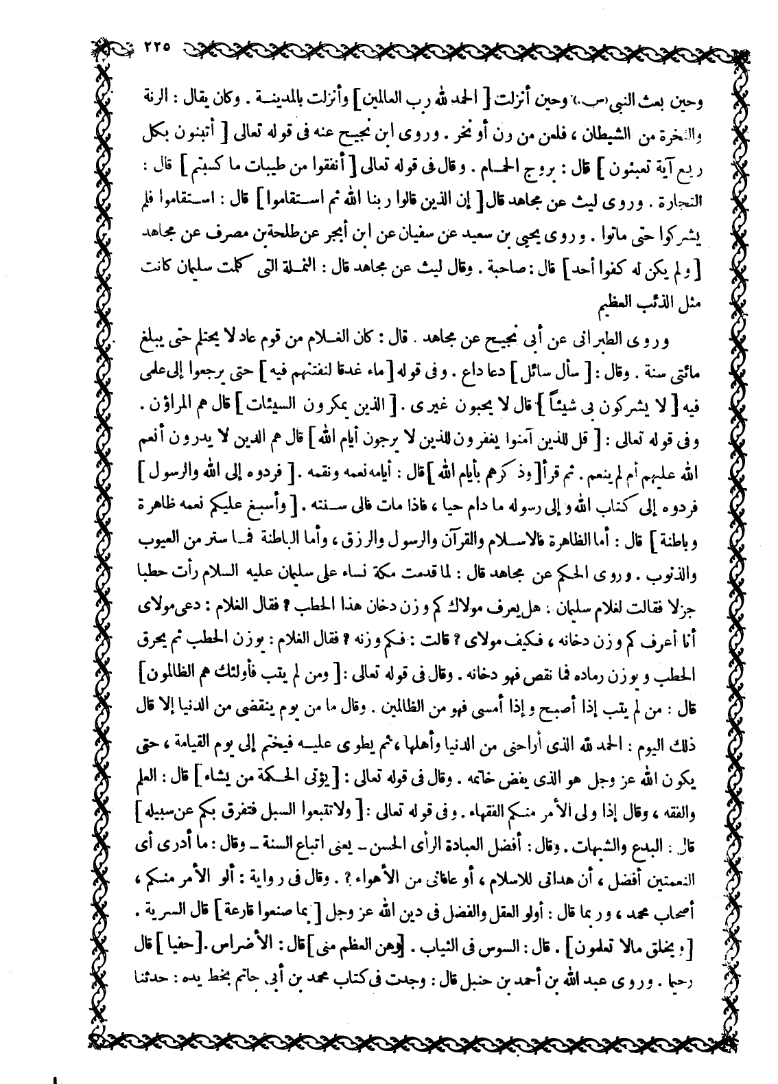 وفي قوله تعالى: قُلْ لِلَّذِينَ آمَنُوا يَغْفِرُوا لِلَّذِينَ لا يَرْجُونَ أَيَّامَ الله 45: 14 قال هم الذين لا يدرون أنعم الله عليهم أم لم ينعم. ثم قرأ وَذَكِّرْهُمْ بِأَيَّامِ الله 14: 5 قال: أيامه نعمه ونقمه. فَرُدُّوهُ إِلَى الله وَالرَّسُولِ 4: 59 فردوه إلى كتاب الله وإلى رسوله ما دام حيا، فإذا مات فإلى سنته. وَأَسْبَغَ عَلَيْكُمْ نِعَمَهُ ظاهِرَةً وَباطِنَةً 31: 20 قال: أما الظاهرة فالإسلام والقرآن والرسول والرزق، وأما الباطنة فما ستر من العيوب والذنوب. وروى الحكم عن مجاهد قال: لما قدمت مكة نساء على سليمان عليه السلام رأت حطبا جزلا فقالت لغلام سليمان: هل يعرف مولاك كم وزن دخان هذا الحطب؟ فقال الغلام: دعي مولاي أنا أعرف كم وزن دخانه، فكيف مولاي؟ قالت: فكم وزنه؟ فقال الغلام: يوزن الحطب ثم يحرق الحطب ويوزن رماده فما نقص فهو دخانه. وقال في قوله تعالى: وَمن لَمْ يَتُبْ فَأُولئِكَ هُمُ الظَّالِمُونَ 49: 11 قال: من لم يتب إذا أصبح وإذا أمسى فهو من الظالمين. وقال ما من يوم ينقضي من الدنيا إلا قال ذلك اليوم: الحمد للَّه الّذي أراحنى من الدنيا وأهلها، ثم يطوى عليه فيختم إلى يوم القيامة، حَتَّى يَكُونَ اللَّهُ عَزَّ وَجَلَّ هُوَ الَّذِي يفض خاتمه. وقال في قوله تعالى: يُؤْتِي الْحِكْمَةَ من يَشاءُ 2: 269 قال: العلم والفقه، وقال إذا ولى الأمر منكم الفقهاء. وفي قوله تعالى: وَلا تَتَّبِعُوا السُّبُلَ فَتَفَرَّقَ بِكُمْ عَنْ سَبِيلِهِ 6: 153 قال: البدع والشبهات. وقال: أفضل العبادة الرأى الحسن- يعنى اتباع السنة- وقال: ما أدرى أي النعمتين أفضل، أن هداني للإسلام، أو عافاني من الأهواء؟. وقال في رواية: أولو الأمر منكم، أصحاب محمد، وربما قال: أولو العقل والفضل في دين الله عز وجل بِما صَنَعُوا قارِعَةٌ 13: 31 قال السرية.