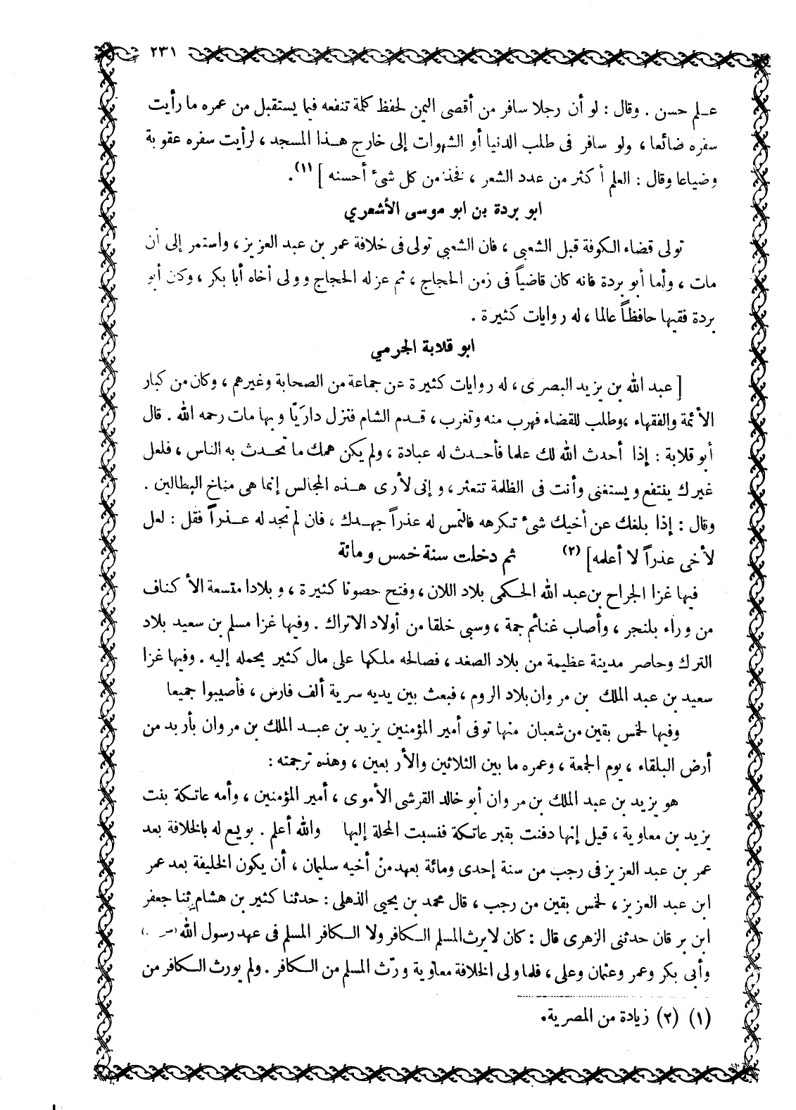 [عبد الله بن يزيد البصري، له روايات كثيرة عن جماعة من الصحابة وغيرهم، وكان من كبار الأئمة والفقهاء، وطلب للقضاء فهرب منه وتغرب، قدم الشام فنزل داريّا وبها مات رحمه الله. قال أبو قلابة: إذا أحدث الله لك علما فأحدث له عبادة، ولم يكن همك ما تحدث به الناس، فلعل غيرك ينتفع ويستغنى وأنت في الظلمة تتعثر، وإني لأرى هذه المجالس إنما هي مناخ البطالين.