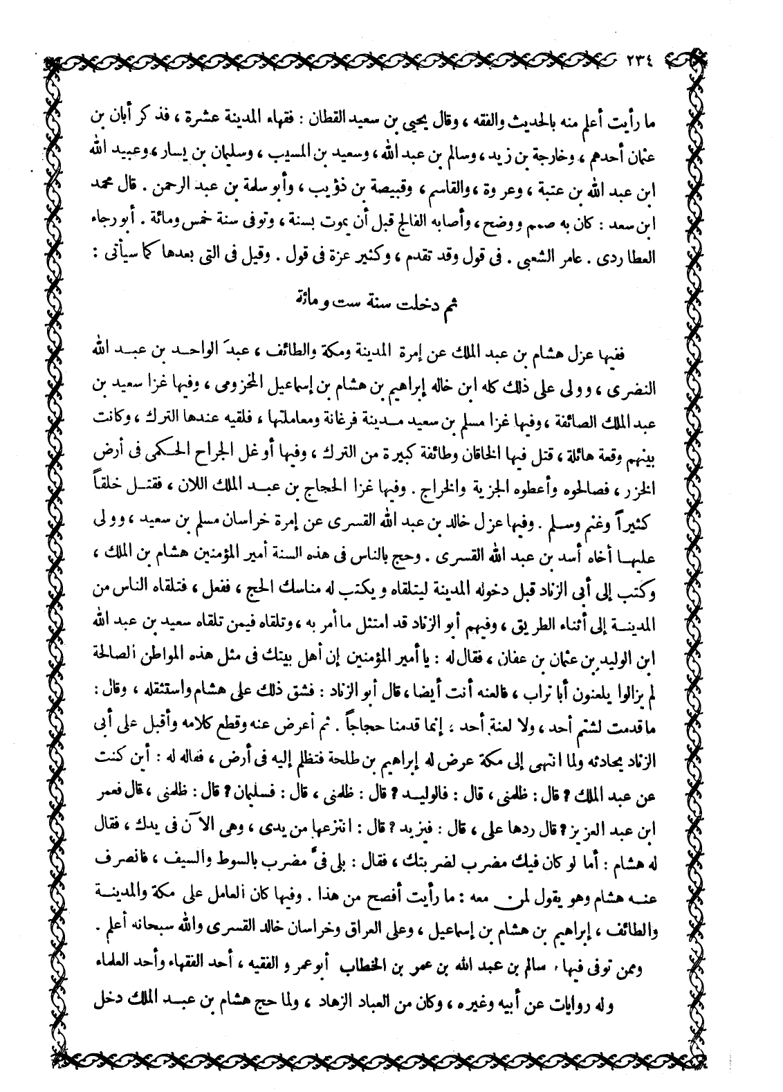 ما قدمت لشتم أحد، ولا لعنة أحد، إنما قدمنا حجاجا. ثم أعرض عنه وقطع كَلَامَهُ وَأَقْبَلَ عَلَى أَبِي الزِّنَادِ يُحَادِثُهُ وَلَمَّا انْتَهَى إِلَى مَكَّةَ عَرَضَ لَهُ إِبْرَاهِيمُ بْنُ طَلْحَةَ فَتَظَلَّمَ إِلَيْهِ فِي أَرْضٍ، فَقَالَهُ لَهُ: أَيْنَ كُنْتَ عَنْ عَبْدِ الْمَلِكِ؟ قَالَ: ظَلَمَنِي، قَالَ: فَالْوَلِيدِ؟ قَالَ: ظَلَمَنِي، قَالَ: فَسُلَيْمَانَ؟ قَالَ: ظلمني، قال فعمر ابن عَبْدِ الْعَزِيزِ؟ قَالَ رَدَّهَا عَلَيَّ، قَالَ: فَيَزِيدَ؟ قَالَ: انْتَزَعَهَا مِنْ يَدِي، وَهِيَ الْآنَ فِي يَدِكَ، فَقَالَ لَهُ هِشَامٌ: أَمَا لَوْ كَانَ فِيكَ مَضْرِبٌ لَضَرَبْتُكَ، فَقَالَ: بَلَى فِيَّ مَضْرِبٌ بالسوط والسيف، فانصرف عنه هشام وهو يقول لمن مَعَهُ: مَا رَأَيْتُ أَفْصَحَ مِنْ هَذَا. وَفِيهَا كَانَ الْعَامِلَ عَلَى مَكَّةَ وَالْمَدِينَةِ وَالطَّائِفِ، إِبْرَاهِيمُ بْنُ هِشَامِ بْنِ إِسْمَاعِيلَ، وَعَلَى الْعِرَاقِ وَخُرَاسَانَ خالد القسري والله سبحانه أعلم.