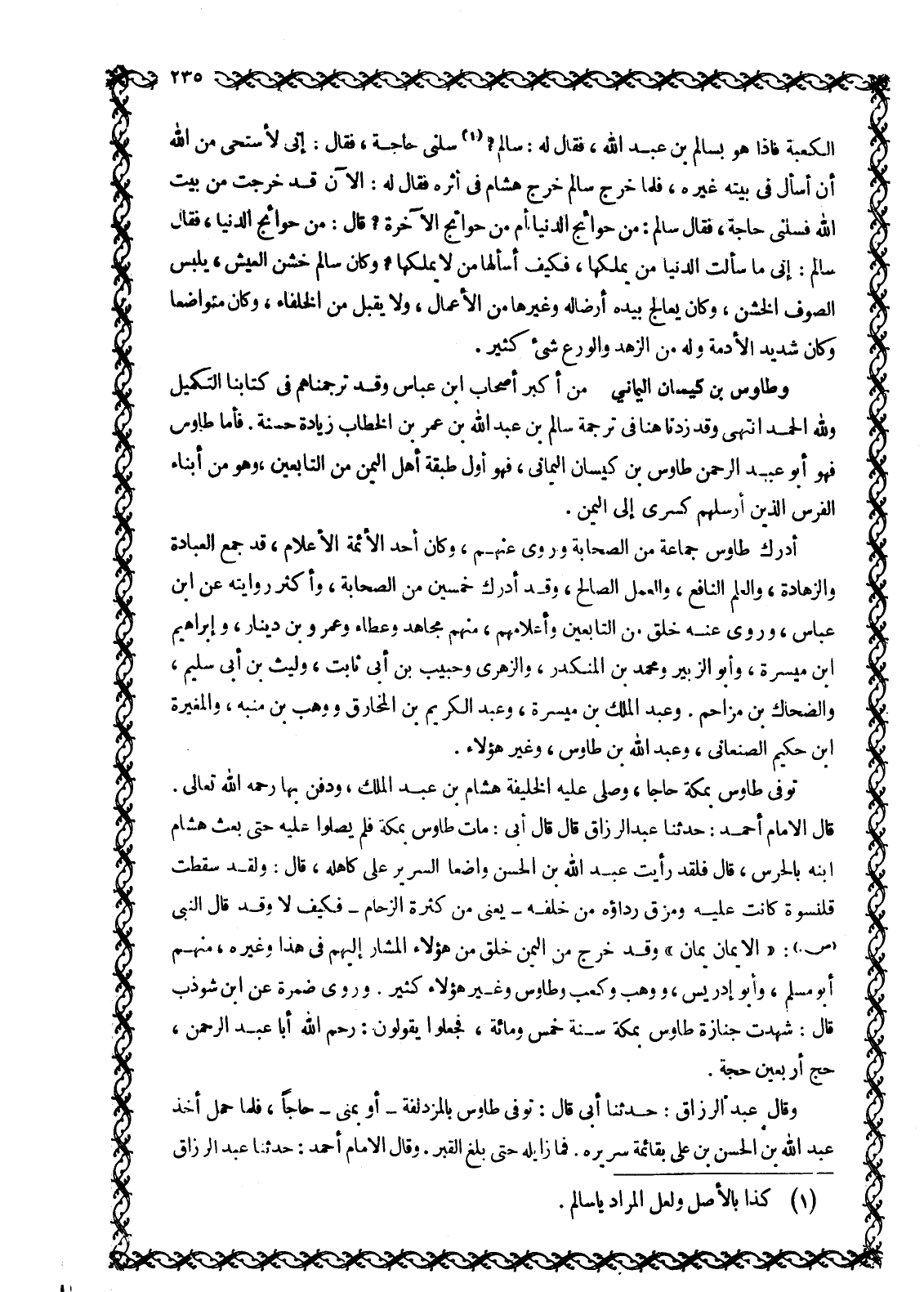 مِنْ أَكْبَرِ أَصْحَابِ ابن عباس وَقَدْ تَرْجَمْنَاهُمْ فِي كِتَابِنَا التَّكْمِيلِ وللَّه الْحَمْدُ انتهى وقد زدنا هنا في ترجمة سَالِمُ بْنِ عَبْدِ اللَّهِ بْنِ عُمَرَ بْنِ الْخَطَّابِ زيادة حسنة. فأما طاوس فهو أبو عبد الرحمن طاوس بن كيسان اليماني، فهو أول طبقة أهل اليمن من التابعين، وهو من أبناء الفرس الذين أرسلهم كسرى إلى اليمن.