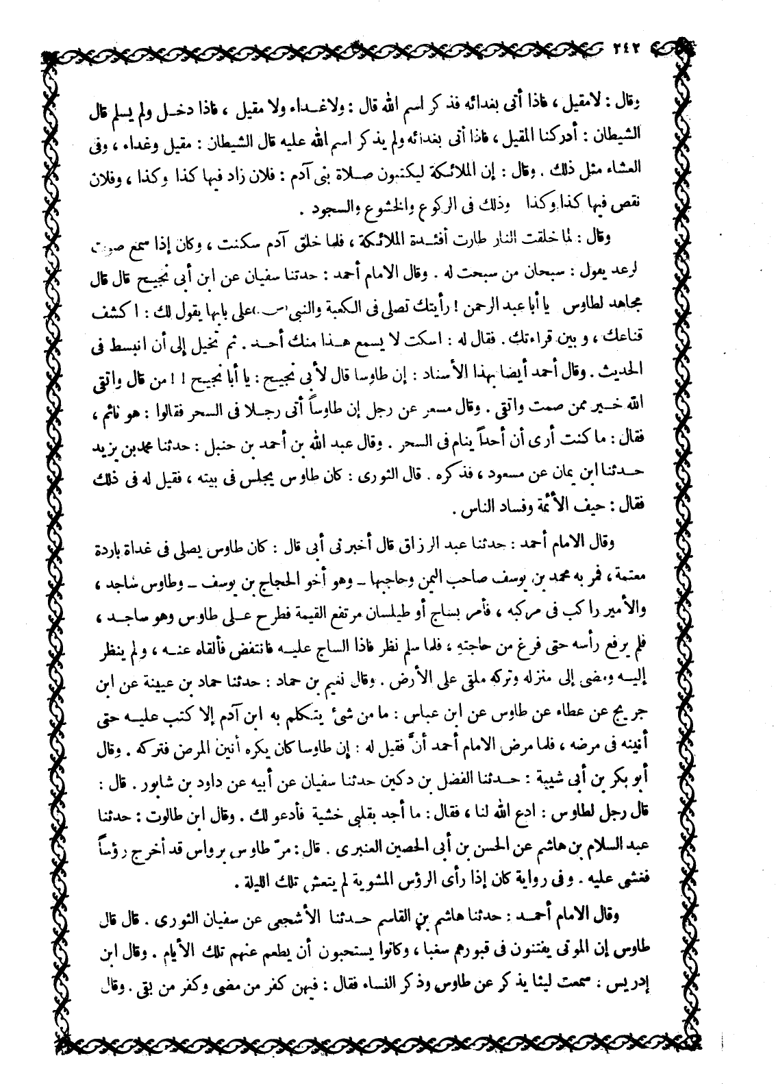 وَقَالَ الْإِمَامُ أَحْمَدُ: حَدَّثَنَا عَبْدُ الرَّزَّاقِ قَالَ أخبرنى أبى قال: كان طاوس يصلى في غداة باردة معتمة، فمر به محمد بن يوسف صاحب اليمن وحاجبها- وهو أخو الحجاج بن يوسف- وطاوس ساجد، والأمير راكب في مركبه، فأمر بساج أو طيلسان مرتفع القيمة فطرح على طاوس وهو ساجد، فلم يرفع رأسه حتى فرغ من حاجته، فلما سلم نظر فإذا الساج عليه فانتفض فألقاه عنه، ولم ينظر إليه ومضى إلى منزله وتركه ملقى على الأرض. وقال نعيم بن حماد: حدثنا حماد بن عُيَيْنَةَ عَنِ ابْنِ جُرَيْجٍ عَنْ عَطَاءٍ عَنْ طَاوُسٍ عَنِ ابْنِ عَبَّاسٍ: ما من شيء يتكلم به ابن آدم إلا كتب عليه حتى أنينه في مرضه، فلما مرض الامام أحمد أنّ فقيل له: إن طاوسا كان يكره أنين المرض فتركه. وَقَالَ أَبُو بَكْرِ بْنُ أَبِي شَيْبَةَ: حَدَّثَنَا الفضل بن دكين حدثنا سفيان عن أبيه عن داود بن شابور. قال: