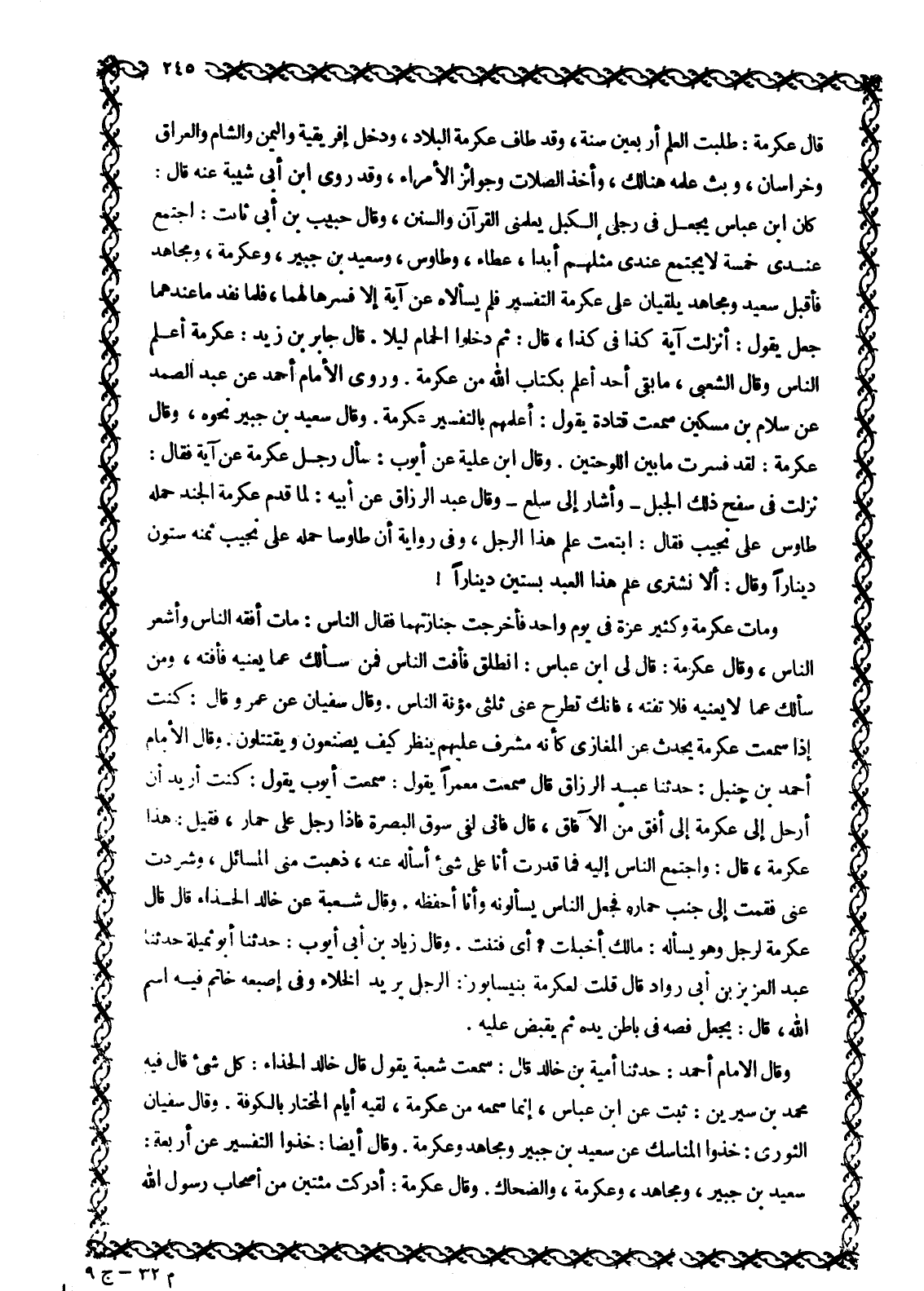 نزلت في سفح ذلك الجبل- وأشار إلى سلع- وقال عبد الرزاق عن أبيه: لما قدم عكرمة الجند حمله طاوس على نجيب فقال: ابتعت علم هذا الرجل، وفي رواية أن طاوسا حمله على نجيب ثمنه ستون دينارا وقال: ألا نشتري علم هذا العبد بستين دينارا! ومات عكرمة وكثير عزة في يوم واحد فأخرجت جنازتهما فقال الناس: مات أفقه الناس وأشعر الناس، وقال عكرمة: قال لي ابن عباس: انطلق فأفت الناس فمن سألك عما يعنيه فأفته، ومن سألك عما لا يعنيه فلا تفته، فإنك تطرح عنى ثلثي مؤنة الناس. وقال سفيان عن عمرو قال: كنت إذا سمعت عكرمة يحدث عن المغازي كأنه مشرف عليهم ينظر كيف يصنعون ويقتتلون. وقال الإمام أحمد بن حنبل: حدثنا عبد الرزاق قال سمعت معمرا يقول: سمعت أيوب يقول: كنت أريد أن أرحل إلى عكرمة إلى أفق من الآفاق، قال فانى لفي سوق البصرة فإذا رجل على حمار، فقيل: هذا عكرمة، قال: واجتمع الناس إليه فما قدرت أنا على شيء أسأله عنه، ذهبت منى المسائل، وشردت عنى فقمت إلى جنب حماره فجعل الناس يسألونه وأنا أحفظه. وقال شعبة عن خالد الحذاء قال قال عكرمة لرجل وهو يسأله: مالك أخبلت؟ أي فتنت. وقال زياد بن أبى أيوب: حدثنا أبو ثميلة حدثنا عبد العزيز بن أبى رواد قال قلت لعكرمة بنيسابور: الرجل يريد الخلاء وفي إصبعه خاتم فيه اسم الله، قال: يجعل فصه في باطن يده ثم يقبض عليه.
