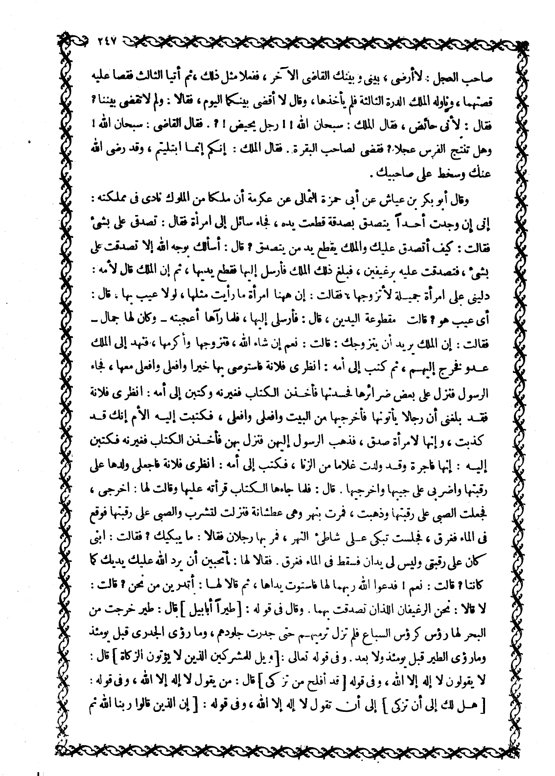 فقال: لأني حائض، فقال الملك: سبحان الله!! رجل يحيض!؟. فقال القاضي: سبحان الله! وهل تنتج الفرس عجلا؟ فقضى لصاحب البقرة. فقال الملك: إنكم إنما ابتليتم، وقد رضى الله عنك وسخط على صاحبيك.