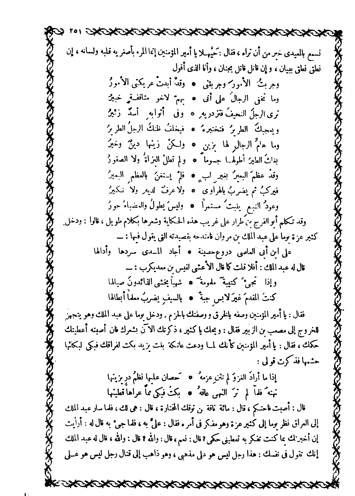 فَقَالَ: يَا أَمِيرَ الْمُؤْمِنِينَ وَصَفَهُ بِالْخُرْقِ وَوَصَفْتُكَ بِالْحَزْمِ. وَدَخَلَ يَوْمًا عَلَى عَبْدِ الْمَلِكِ وَهُوَ يَتَجَهَّزُ لِلْخُرُوجِ إِلَى مُصْعَبِ بْنِ الزُّبَيْرِ فَقَالَ: وَيْحَكَ يَا كُثَيِّرُ، ذَكَرْتُكَ الْآنَ بِشِعْرِكَ فَإِنْ أَصَبْتَهُ أَعْطَيْتُكَ حُكْمَكَ، فَقَالَ: يَا أَمِيرَ الْمُؤْمِنِينَ كَأَنَّكَ لَمَّا وَدَّعْتَ عَاتِكَةَ بِنْتَ يَزِيدَ بَكَتْ لِفِرَاقِكَ فَبَكَى لِبُكَائِهَا حَشَمُهَا فَذَكَرْتَ قَوْلِي: