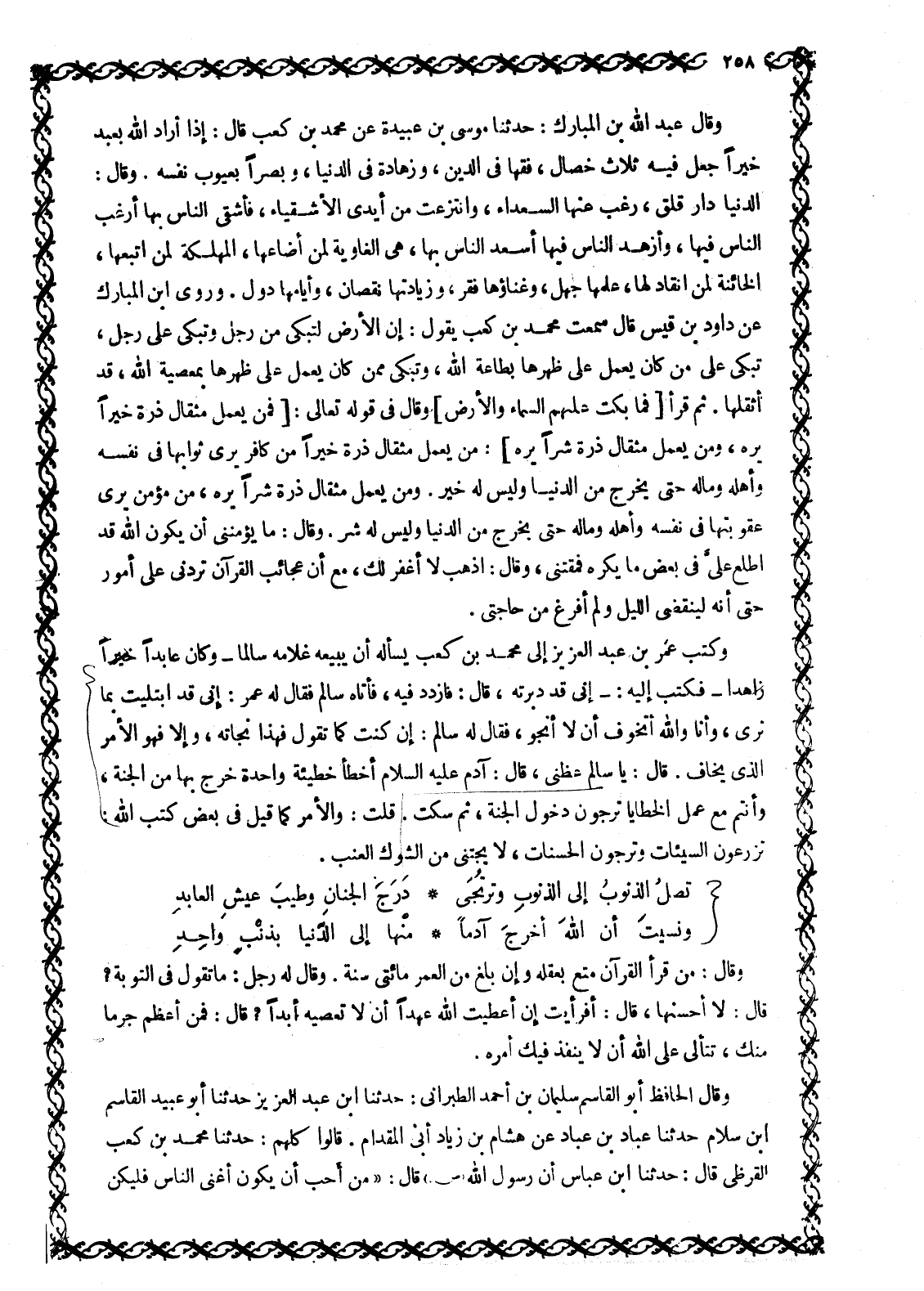 وقال عبد الله بن المبارك: حدثنا مُوسَى بْنُ عُبَيْدَةَ عَنْ مُحَمَّدِ بْنِ كَعْبٍ قال: إذا أراد الله بعبد خيرا جعل فيه ثلاث خصال، فقها في الدين، وزهادة في الدنيا، وبصرا بعيوب نفسه. وقال: