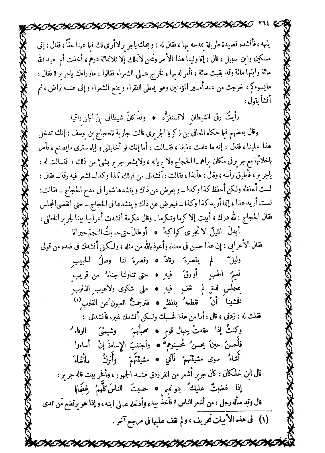 لست أريد هَذَا، إِنَّمَا أُرِيدُ كَذَا وَكَذَا فَيُعْرِضُ عَنْ ذاك وينشدها في الْحَجَّاجِ- حَتَّى انْقَضَى الْمَجْلِسُ فَقَالَ الْحَجَّاجُ: للَّه دَرُّكَ، أَبَيْتَ إِلَّا كَرَمًا وَتَكَرُّمًا. وَقَالَ عِكْرِمَةُ أَنْشَدْتُ أَعْرَابِيًّا بَيْتًا لِجَرِيرٍ الْخَطَفَى: