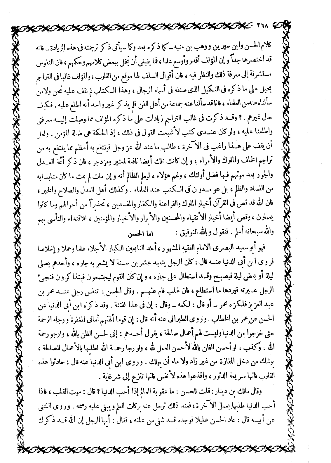 كلام الحسن وابن سيرين ووهب بن منبه- كما ذكره بعد وكما سيأتي ذكر ترجمته في هذه الزيادة- فإنه قد اختصرها جدا وإن المؤلف أقدر وأوسع علما، فما ينبغي أن يخل ببعض كلامهم وحكمهم، فان النفوس مستشرفة إلى معرفة ذلك والنظر فيه، فان أقوال السلف لها موقع من القلوب، والمؤلف غالبا في التراجم يحيل على ما ذكره في التكميل الّذي صنفه في أسماء الرجال، وهذا الكتاب لم نقف عليه نحن ولا من سألناه عنه من العلماء، فانا قد سألنا عنه جماعة من أهل الفن فلم يذكر غير واحد أنه اطلع عليه، فكيف حال غيرهم.؟ وقد ذكرت في غالب التراجم زيادات على ما ذكره المؤلف مما وصلت إليه معرفتي وأطلعنا عليه، ولو كان عندي كتب لأشبعت القول في ذلك، إذ الحكمة هي ضالة المؤمن. ولعل أن يقف على هذا راغب في الآخرة، طالب ما عند الله عز وجل فينتفع به أعظم مما ينتفع به من تراجم الخلف والملوك والأمراء، وإن كانت تلك أيضا نافعة لمتعير ومزدجر، فان ذكر أئمة العدل والجور بعد موتهم فيها فضل أولئك، وغم هؤلاء، ليعلم الظالم أنه وإن مات لم يمت ما كان متلبسا به من الفساد والظلم، بل هو مدون في الكتب عند العلماء. وكذلك أهل العدل والصلاح والخير، فان الله قد قص في القرآن أخبار الملوك والفراعنة والكفار والمفسدين، تحذيرا من أحوالهم وما كانوا يعملون، وقص أيضا أخبار الأتقياء والمحسنين والأبرار والأخيار والمؤمنين، للاقتداء والتأسي بهم والله سبحانه أعلم. فنقول وباللَّه التوفيق: