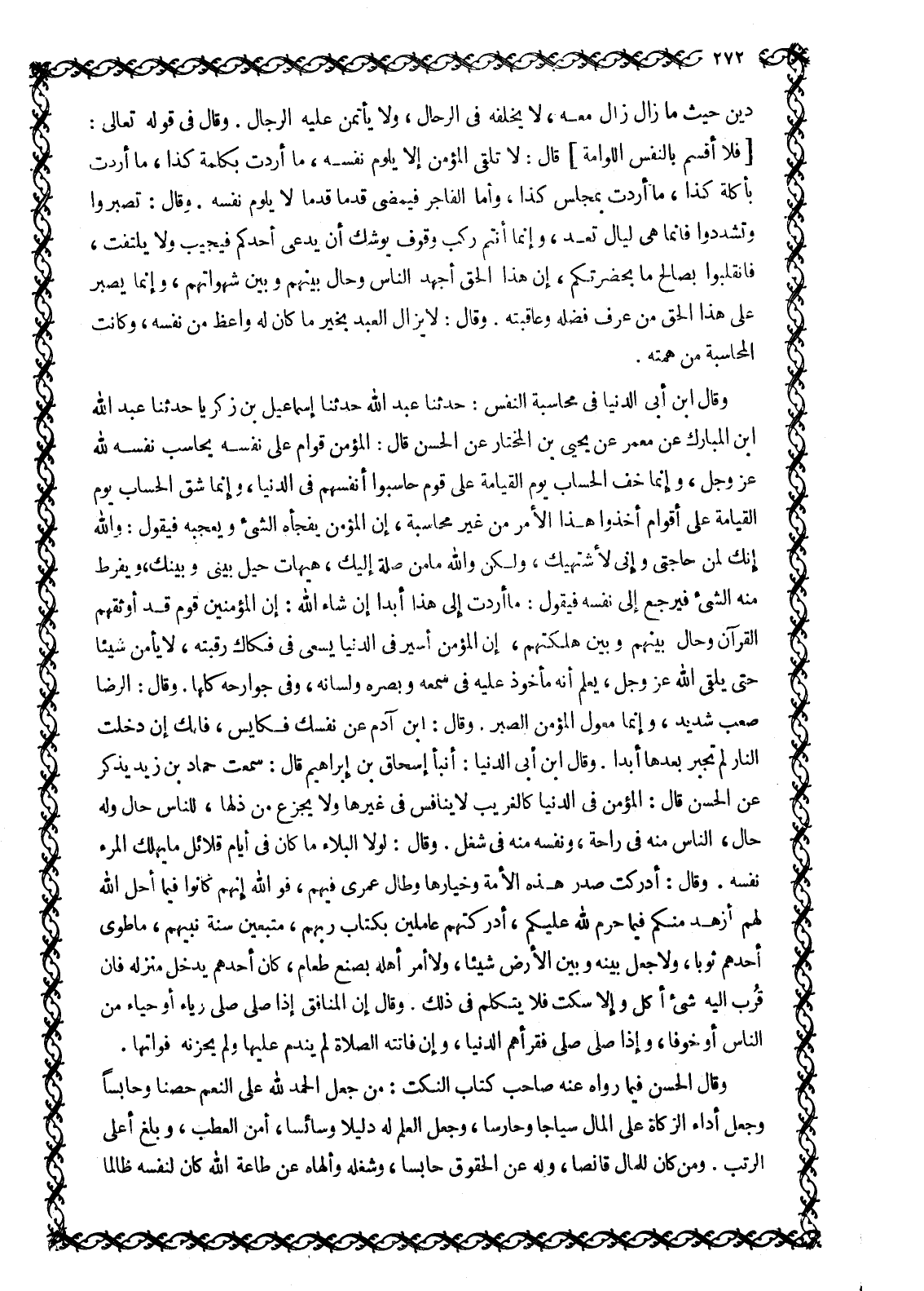 وقال ابن أبى الدنيا في محاسبة النفس: حدثنا عبد الله حدثنا إسماعيل بن زكريا حدثنا عبد الله ابن المبارك عن معمر عن يحيى بن المختار عن الحسن قال: المؤمن قوام على نفسه يحاسب نفسه للَّه عز وجل، وإنما خف الحساب يوم القيامة على قوم حاسبوا أنفسهم في الدنيا، وإنما شق الحساب يوم القيامة على أقوام أخذوا هذا الأمر من غير محاسبة، إن المؤمن يفجأه الشيء ويعجبه فيقول: والله إنك لمن حاجتي وإني لأشتهيك، ولكن والله ما من صلة إليك، هيهات حيل بيني وبينك، ويفرط منه الشيء فيرجع إلى نفسه فيقول: ما أردت إلى هذا أبدا إن شاء الله: إن المؤمنين قوم قد أوثقهم القرآن وحال بينهم وبين هلكتهم، إن المؤمن أسير في الدنيا يسعى في فكاك رقبته، لا يأمن شيئا حتى يلقى الله عز وجل، يعلم أنه مأخوذ عليه في سمعه وبصره ولسانه، وفي جوارحه كلها. وقال: الرضا صعب شديد، وإنما معول المؤمن الصبر. وقال: ابن آدم عن نفسك فكايس، فإنك إن دخلت النار لم تجبر بعدها أبدا. وقال ابن أبى الدنيا: أنبأ إسحاق بن إبراهيم قال: سمعت حماد بن زيد يذكر عن الحسن قال: المؤمن في الدنيا كالغريب لا ينافس في غيرها ولا يجزع من ذلها، للناس حال وله حال، الناس منه في راحة، ونفسه منه في شغل. وقال: لولا البلاء ما كان في أيام قلائل ما يهلك المرء نفسه. وقال: أدركت صدر هذه الأمة وخيارها وطال عمري فيهم، فو الله إنهم كانوا فيما أحل الله لهم أزهد منكم فيما حرم للَّه عليكم، أدركتهم عاملين بكتاب ربهم، متبعين سنة نبيهم، ما طوى أحدهم ثوبا، ولا جعل بينه وبين الأرض شيئا، ولا أمر أهله بصنع طعام، كان أحدهم يدخل منزله فان قرب اليه شيء أكل وإلا سكت فلا يتكلم في ذلك. وقال إن المنافق إذا صلى صلى رياء أو حياء من الناس أو خوفا، وإذا صلى صلى فقرأهم الدنيا، وإن فاتته الصلاة لم يندم عليها ولم يحزنه فواتها.