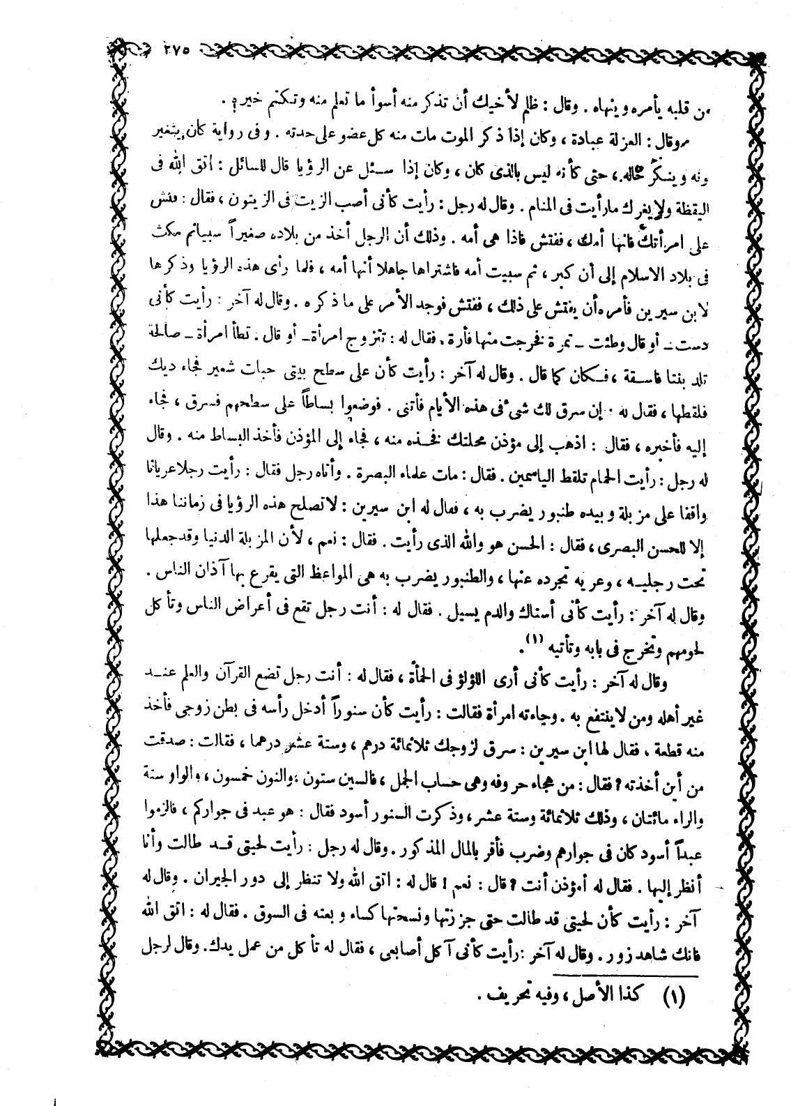 وقال له آخر: رأيت كأنى أرى اللؤلؤ في الحمأة، فقال له: أنت رجل تضع القرآن والعلم عند غير أهله ومن لا ينتفع به. وجاءته امرأة فقالت: رأيت كأن سنورا أدخل رأسه في بطن زوجي فأخذ منه قطعة، فقال لها ابن سيرين: سرق لزوجك ثلاثمائة درهم، وستة عشر درهما، فقالت: صدقت من أين أخذته؟ فقال: من هجاء حروفه وهي حساب الجمل، فالسين ستون، والنون خمسون، والواو ستة والراء مائتان، وذلك ثلاثمائة وستة عشر، وذكرت السنور أسود فقال: هو عبد في جواركم، فالزموا عبدا أسود كان في جوارهم وضرب فأقر بالمال المذكور. وقال له رجل: رأيت لحيتي قد طالت وأنا انظر إليها. فقال له أمؤذن أنت؟ قال: نعم! قال له: اتّق الله ولا تنظر إلى دور الجيران. وقال له آخر: رأيت كأن لحيتي قد طالت حتى جززتها ونسجتها كساء وبعته في السوق. فقال له: اتّق الله فإنك شاهد زور. وقال له آخر: رأيت كأنى آكل أصابعى، فقال له تأكل من عمل يدك. وقال لرجل