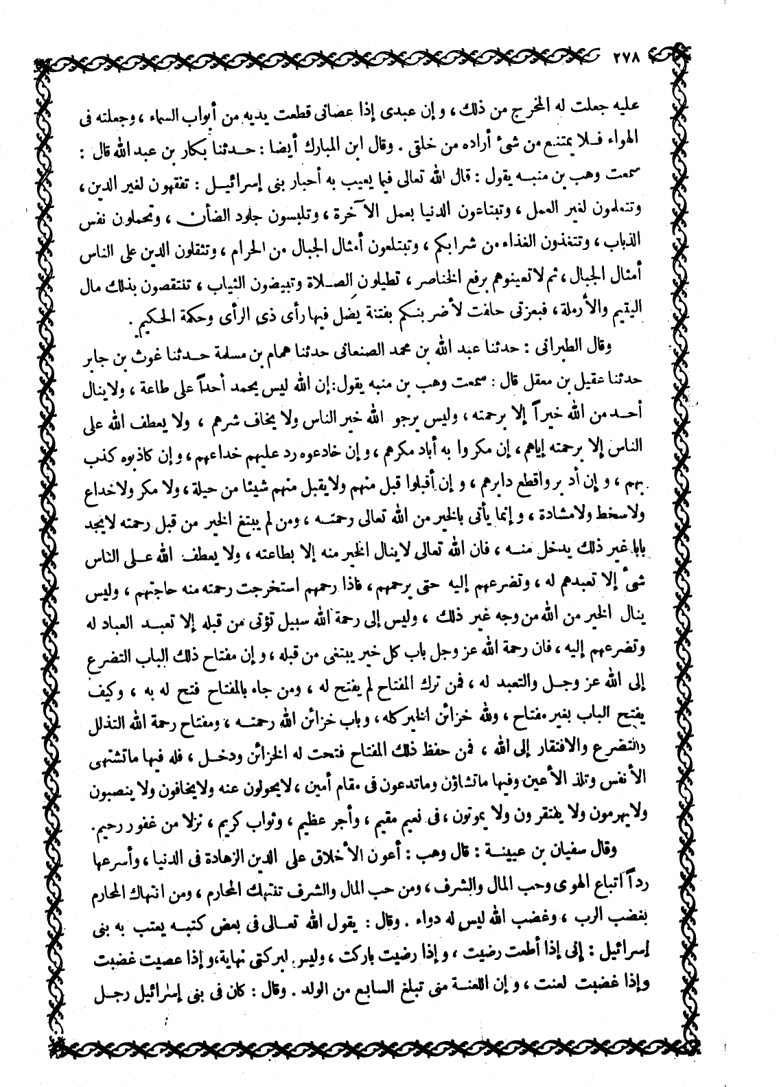 وقال سفيان بن عيينة: قال وهب: أعون الأخلاق على الدين الزهادة في الدنيا، وأسرعها ردا اتباع الهوى وحب المال والشرف، ومن حب المال والشرف تنتهك المحارم، ومن انتهاك المحارم يغضب الرب، وغضب الله ليس له دواء. وقال: يقول الله تعالى في بعض كتبه يعتب به بنى إسرائيل: إني إذا أطعت رضيت، وإذا رضيت باركت، وليس لبركتي نهاية. وإذا عصيت غضبت وإذا غضبت لعنت، وإن اللعنة منى تبلغ السابع من الولد. وقال: كان في بنى إسرائيل رجل