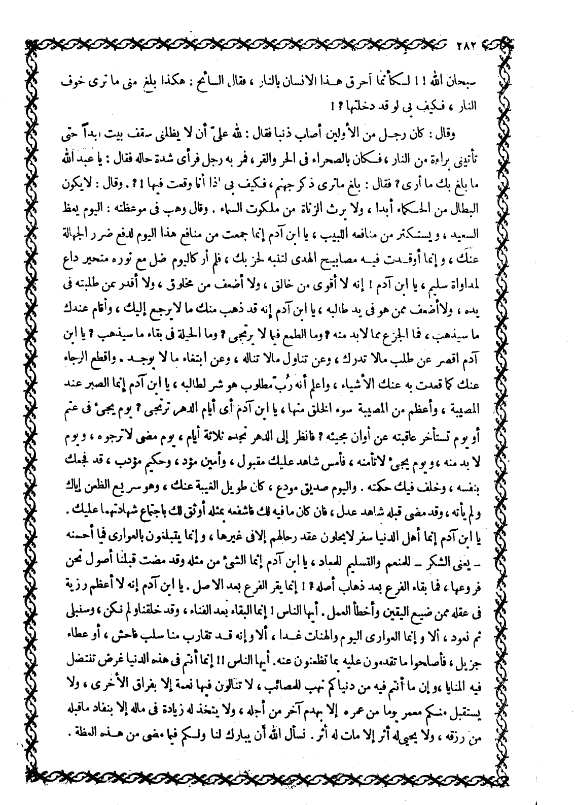 سبحان الله!! لكأنما أحرق هذا الإنسان بالنار، فقال السائح: هكذا بلغ منى ما ترى خوف النار، فكيف بى لو قد دخلتها؟! وقال: كان رجل من الأولين أصاب ذنبا فقال: للَّه عليّ أن لا يظلني سقف بيت أبدا حتى تأتينى براءة من النار، فكان بالصحراء في الحر والقر، فمر به رجل فرأى شدة حاله فقال: يا عبد الله ما بلغ بك ما أرى؟ فقال: بلغ ما ترى ذكر جهنم، فكيف بى إذا أنا وقعت فيها!؟. وقال: لا يكون البطال من الحكماء أبدا، ولا يرث الزناة من ملكوت السماء، وقال وهب في موعظته: اليوم يعظ السعيد، ويستكثر من منافعه اللبيب، يا ابن آدم إنما جمعت من منافع هذا اليوم لدفع ضرر الجهالة عنك، وإنما أوقدت فيه مصابيح الهدى لتنبه لحزبك، فلم أر كاليوم ضل مع نوره متحير داع لمداواة سليم، يا ابن آدم! إنه لا أقوى من خالق، ولا أضعف من مخلوق، ولا أقدر ممن طلبته في يده، ولا أضعف ممن هو في يد طالبه، يا ابن آدم إنه قد ذهب منك ما لا يرجع إليك، وأقام عندك ما سيذهب، فما الجزع مما لا بدّ منه؟ وما الطمع فيما لا يرتجى؟ وما الحيلة في بقاء ما سيذهب؟ يا ابن آدم اقصر عن طلب ما لا تدرك، وعن تناول ما لا تناله، وعن ابتغاء ما لا يوجد، واقطع الرجاء عنك كما قعدت به عنك الأشياء، واعلم أنه ربّ مطلوب هو شر لطالبه، يا ابن آدم إنما الصبر عند المصيبة، وأعظم من المصيبة سوء الخلق منها، يا ابن آدم أي أيام الدهر ترتجى؟ يوم يجيء في عتم أو يوم تستأخر عاقبته عن أوان مجيئه؟ فانظر إلى الدهر تجده ثلاثة أيام، يوم مضى لا ترجوه، ويوم لا بد منه، ويوم يجيء لا تأمنه، فأمس شاهد عليك مقبول، وأمين مؤد، وحكيم مؤدب، قد فجعك بنفسه، وخلف فيك حكمته. واليوم صديق مودع، كان طويل الغيبة عنك، وهو سريع الظعن إياك ولم يأته، وقد مضى قبله شاهد عدل، فان كان ما فيه لك فاشفعه بمثله أوثق لك باجتماع شهادتهما عليك.