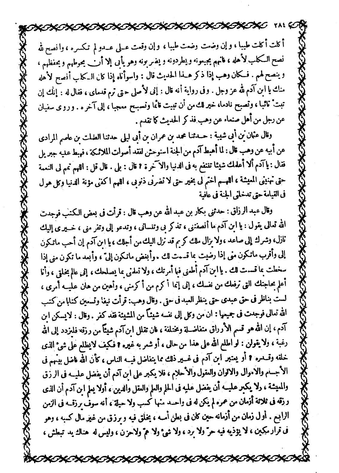 وقال عبد الرزاق: حدثني بكار بن عبد الله عن وهب قال: قرأت في بعض الكتب فوجدت الله تعالى يقول: يا ابن آدم ما أنصفتنى، تذكر بى وتنساني، وتدعو إلى وتفر منى، خيرى إليك نازل، وشرك إلى صاعد، ولا يزال ملك كريم قد نزل إليك من أجلك، يا ابن آدم إن أحب ما تكون إلى وأقرب ما تكون منى إذا رضيت بما قسمت لك، وأبغض ما تكون إليّ، وأبعد ما تكون منى إذا سخطت بما قسمت لك. يا ابن آدم أطعنى فيما أمرتك، ولا تعلمني بما يصلحك، إني عالم بخلقي، وأنا أعلم بحاجتك التي ترفعك من نفسك، إني إِنَّمَا أُكْرِمُ مَنْ أَكْرَمَنِي، وَأُهِينَ مَنْ هَانَ عليه أمرى، لست بناظر في حق عبدي حتى ينظر العبد في حقي. وقال وهب: قرأت نيفا وتسعين كتابا من كتب الله تعالى فوجدت في جميعها: ان من وكل إلى نفسه شيئا من المشيئة فقد كفر. وقال: لا يسكن ابن آدم، إن الله هو قسم الأرزاق متفاضلة ومختلفة، فان تقلل ابن آدم شيئا من رزقه فليزدد إلى الله رغبة، ولا يقولن: لو اطلع الله على هذا من حالي، أو شعر به غيره؟ فكيف لا يطلع على شيء الّذي خلقه وقدره؟ أو يعتبر ابن آدم في غير ذلك مما يتفاضل فيه الناس، كأن الله فاضل بينهم في الأجسام والأموال والألوان والعقول والأحلام، فلا يكبر على ابن آدم أن يفضل عليه في الرزق والمعيشة، ولا يكبر عليه أن يفضل عليه في الحلم والعلم والعقل والدين، أو لا يعلم ابن آدم أن الّذي رزقه في ثلاثة أزمان من عمره لم يكن له في واحد منها كسب ولا حيلة، أنه سوف يرزقه في الزمن الرابع. أول زمان من أزمانه حين كان في بطن أمه، يخلق فيه ويرزق من غير مال كسبه، وهو في قرار مكين، لا يؤذيه فيه حرّ ولا برد، ولا شيء ولا همّ ولا حزن، وليس له هناك يد تبطش،