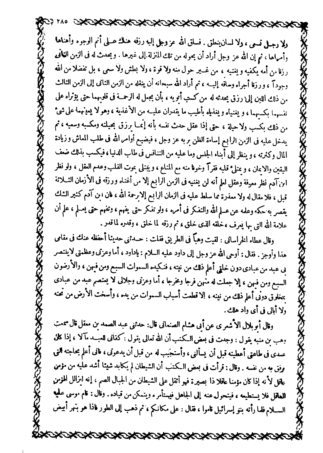 ولا رجل تسعى، ولا لسان ينطق. فساق الله عز وجل إليه رزقه هناك على أتم الوجوه وأهناها وأمراها، ثم إن الله عز وجل أراد أن يحوله من تلك المنزلة إلى غيرها. ويحدث له في الزمن الثاني رزقا من أمه يكفيه ويغنيه، من غير حول منه ولا قوة، ولا بطش ولا سعى، بل تفضلا من الله وجودا، ورزقا أجراه وساقه إليه، ثم أراد الله سبحانه أن ينقله من الزمن الثاني إلى الزمن الثالث من ذلك اللبن إلى رزق يحدثه له من كسب أبويه، بأن يجعل له الرحمة في قلوبهما حتى يؤثراه على نفسهما بكسبهما، ويغنياه ويغذياه بأطيب ما يقدران عليه من الأغذية، وهو لا يعينهما على شيء من ذلك بكسب ولا حيلة، حتى إذا عقل حدث نفسه بأنه إنما يرزق بحيلته ومكسبه وسعيه، ثم يدخل عليه في الزمن الرابع إساءة الظن بربه عز وجل، فيضيع أوامر الله في طلب المعاش وزيادة المال وكثرته، وينظر إلى أبناء الجنس وما عليه من التنافس في طلب الدنيا، فيكسب بذلك ضعف اليقين والايمان، ويمتلئ قلبه فقرا وخوفا منه مع المتاع، ويبتلى بموت القلب وعدم العقل، ولو نظر ابن آدم نظر معرفة وعقل لعلم أنه لن يغنيه في الزمن الرابع إلا من أغناه ورزقه في الأزمان الثلاثة قبل، فلا مقال له ولا معذرة مما سلط عليه في الزمان الرابع إلا برحمة الله، فان ابن آدم كثير الشك يقصر به حكمه وعلمه عن علم الله والتفكر في أمره، ولو تفكر حتى يفهم، وتفهم حتى يعلم، علم أن علامة الله التي بها يعرف، خلقه الّذي خلق، ثم رزقه لما خلق، وقدره لما قدر.