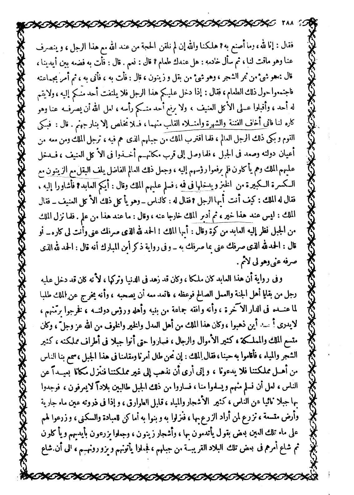 فقال: إنا للَّه، وما أصنع به؟ هلكنا والله إن لم نلقن الحجة من عند الله مع هذا الرجل، وينصرف عنا وهو ماقت لنا، ثم سأل خادمه: هل عندك طعام؟ قال: نعم. قال: فأت به فضعه بين أيدينا، قال: هو شيء من ثمر الشجر، وهو شيء من بقل وزيتون، قال: فأت به، فأتى به، ثم أمر بجماعته فاجتمعوا حول ذلك الطعام، فقال: إذا دخل عليكم هذا الرجل فلا يلتفت أحد منكم إليه، ولا يقم له أحد، وأقبلوا على الأكل العنيف، ولا يرفع أحد منكم رأسه، لعل الله أن يصرفه عنا وهو كاره لنا فانى أخاف الفتنة والشهرة وامتلاء القلب منهما، فلا نخلص إلا بنار جهنم. قال: فبكى القوم وبكى ذلك الرجل العالم، فلما اقترب الملك من جبلهم الّذي هم فيه، ترجل الملك ومن معه من أعيان دولته وصعد في الجبل، فلما وصل إلى قرب مكانهم أخذوا في الأكل العنيف، فدخل عليهم الملك وهم يأكلون فلم يرفعوا رءوسهم إليه، وجعل ذلك العالم الفاضل يلف البقل مع الزيتون مع الكسرة الكبيرة من الخبز ويدخلها في فمه، فسلم عليهم الملك وقال: أيكم العابد؟ فأشاورا إليه، فقال له الملك: كيف أنت أيها الرجل؟ فقال له: كالناس- وهو يأكل ذلك الأكل العنيف- فقال الملك: ليس عند هذا خير، ثم أدبر الملك خارجا عنه، وقال: ما عند هذا من علم. فلما نزل الملك من الجبل نظر إليه العابد من كوة وقال: أيها الملك! الحمد للَّه الّذي صرفك عنى وأنت لي كاره- أو قال: الحمد للَّه الّذي صرفك عنى بما صرفك به- وفي رواية ذكر ابن المبارك أنه قال: الحمد للَّه الّذي صرفه عنى وهو لي لائم.