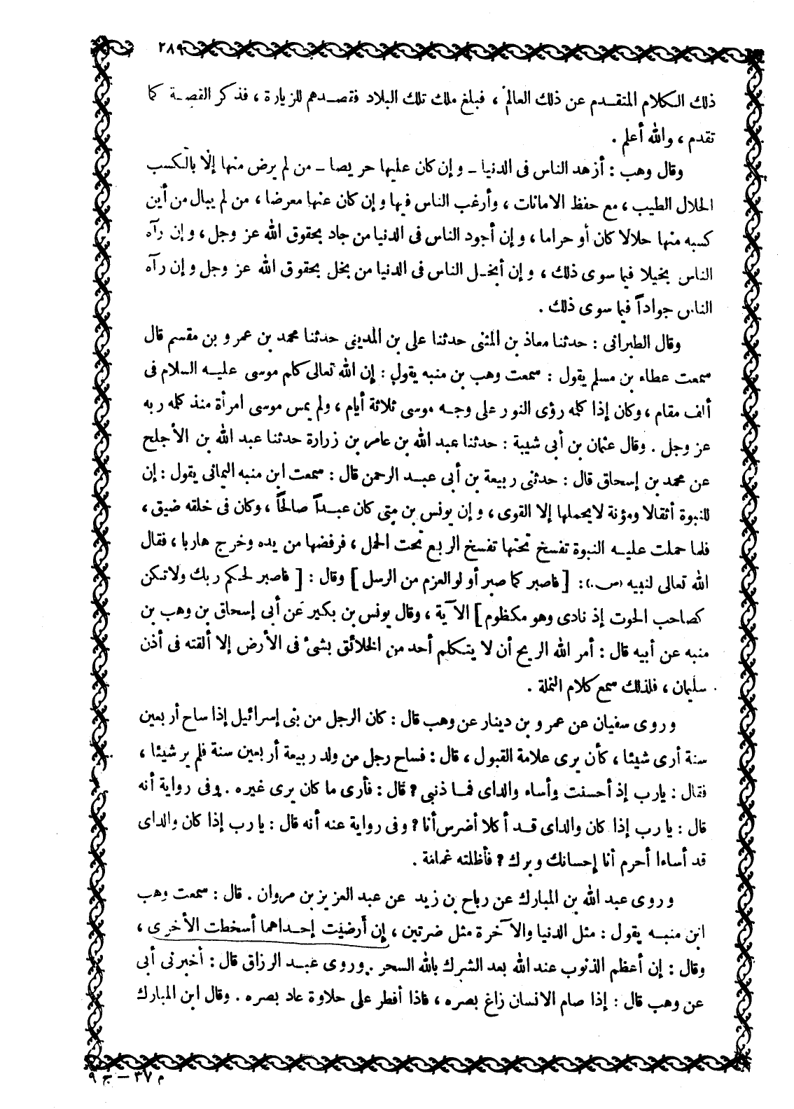 وروى عبد الله بن المبارك عن رباح بن زيد عن عبد العزيز بن مروان. قال: سمعت وهب ابن منبه يقول: مثل الدنيا والآخرة مثل ضرتين، إن أرضيت إحداهما أسخطت الأخرى، وقال: إن أعظم الذنوب عند الله بعد الشرك باللَّه السحر. وروى عبد الرزاق قال: أخبرنى أبى عن وهب قال: إذا صام الإنسان زاغ بصره، فإذا أفطر على حلاوة عاد بصره. وقال ابن المبارك