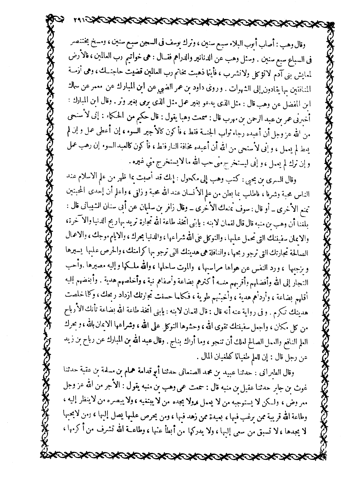 وقال وهب: أصاب أيوب البلاء سبع سنين، وترك يوسف في السجن سبع سنين، ومسخ بخت نصّر في السباع سبع سنين. وسئل وهب عن الدنانير والدراهم فقال: هي خواتيم رب العالمين، فالأرض لمعايش بنى آدم لا تؤكل ولا تشرب، فأينما ذهبت بخاتم رب العالمين قضيت حاجتك، وهي أزمة المنافقين بها يقادون إلى الشهوات. وروى داود بن عمر الضبي عن ابن المبارك عن معمر عن سماك ابن المفضل عن وهب قال: مثل الّذي يدعو بغير عمل مثل الّذي يرمى بغير وتر. وقال ابن المبارك: