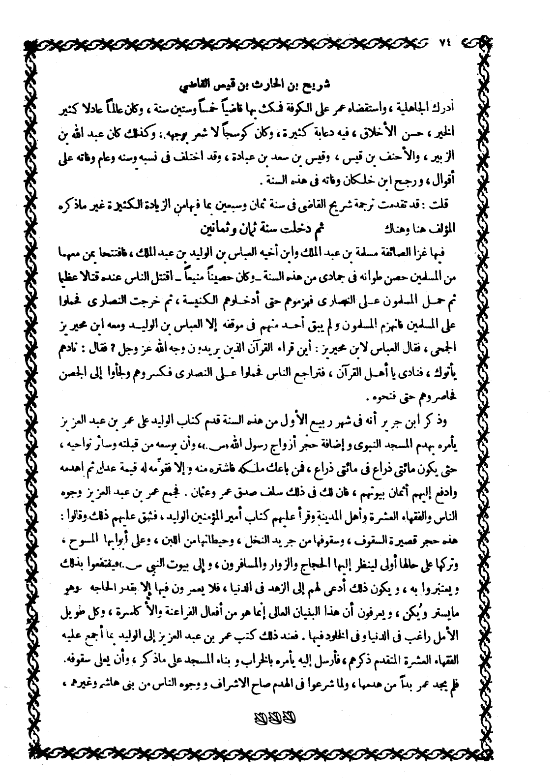 أَدْرَكَ الْجَاهِلِيَّةَ، وَاسْتَقْضَاهُ عُمَرُ عَلَى الْكُوفَةِ فَمَكَثَ بِهَا قَاضِيًا خَمْسًا وَسِتِّينَ سَنَةً، وَكَانَ عَالِمًا عَادِلًا كَثِيرَ الْخَيْرِ، حَسَنَ الْأَخْلَاقِ، فِيهِ دُعَابَةٌ كَثِيرَةٌ، وَكَانَ كَوْسَجًا لَا شَعْرَ بِوَجْهِهِ، وَكَذَلِكَ كَانَ عَبْدُ اللَّهِ بْنُ الزُّبَيْرِ، وَالْأَحْنَفُ بْنُ قَيْسٍ، وقيس بن سعد بن عبادة، وَقَدِ اخْتُلِفَ فِي نَسَبِهِ وَسِنِّهِ وَعَامِ وَفَاتِهِ عَلَى أَقْوَالٍ، وَرَجَّحَ ابْنُ خَلِّكَانَ وَفَاتَهُ فِي هذه السنة.