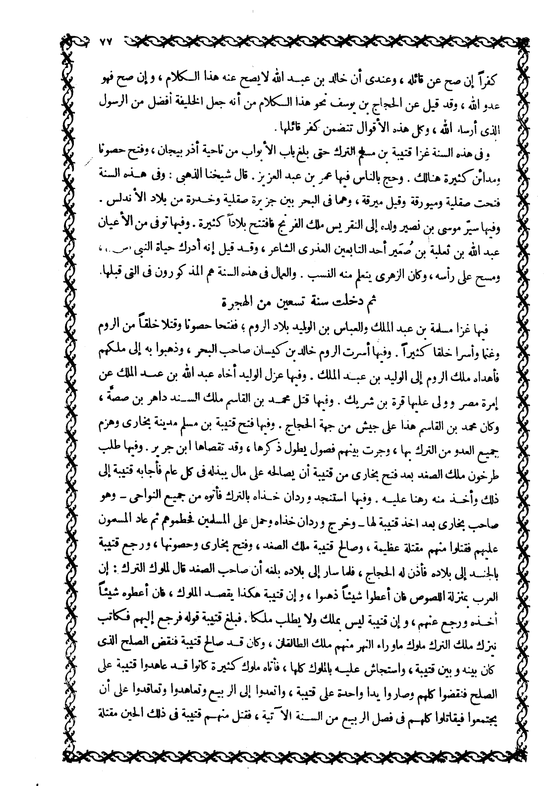 كُفْرًا إِنْ صَحَّ عَنْ قَائِلِهِ، وَعِنْدِي أَنَّ خالد بن عبد الله لَا يَصِحُّ عَنْهُ هَذَا الْكَلَامُ، وَإِنْ صَحَّ فَهُوَ عَدُوُّ اللَّهِ، وَقَدْ قِيلَ عَنِ الْحَجَّاجِ بْنِ يُوسُفَ نَحْوُ هَذَا الْكَلَامِ مِنْ أَنَّهُ جَعَلَ الْخَلِيفَةَ أَفْضَلَ مِنَ الرَّسُولِ الَّذِي أَرْسَلَهُ اللَّهُ، وَكُلُّ هَذِهِ الْأَقْوَالِ تَتَضَمَّنُ كُفْرَ قَائِلِهَا.