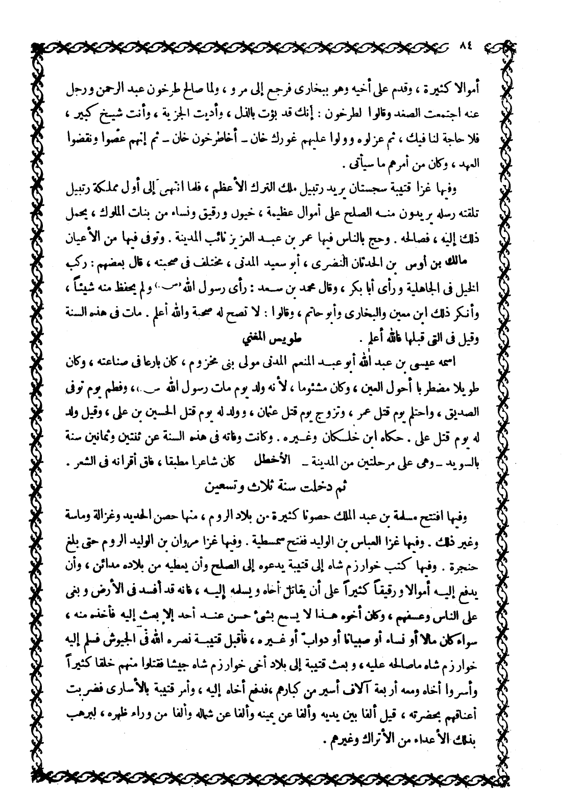 وَفِيهَا افْتَتَحَ مَسْلَمَةُ بْنُ عَبْدِ الْمَلِكِ حُصُونًا كَثِيرَةً مِنْ بِلَادِ الرُّومِ، مِنْهَا حِصْنُ الْحَدِيدِ وَغَزَالَةُ وَمَاسَةُ وَغَيْرُ ذَلِكَ. وَفِيهَا غَزَا الْعَبَّاسُ بن الوليد ففتح سمسطية. وَفِيهَا غَزَا مَرْوَانُ بْنُ الْوَلِيدِ الرُّومَ حَتَّى بلغ حنجرة. وَفِيهَا كَتَبَ خَوَارِزْمُ شَاهْ إِلَى قُتَيْبَةَ يَدْعُوهُ إِلَى الصُّلْحِ وَأَنْ يُعْطِيَهُ مِنْ بِلَادِهِ مَدَائِنَ، وَأَنْ يَدْفَعَ إِلَيْهِ أَمْوَالًا وَرَقِيقًا كَثِيرًا عَلَى أَنْ يُقَاتِلَ أَخَاهُ وَيُسَلِّمَهُ إِلَيْهِ، فَإِنَّهُ قَدْ أَفْسَدَ فِي الْأَرْضِ وَبَغَى عَلَى النَّاسِ وَعَسَفَهُمْ، وَكَانَ أَخُوهُ هَذَا لَا يَسْمَعُ بِشَيْءٍ حَسَنٍ عِنْدَ أَحَدٍ إِلَّا بَعَثَ إِلَيْهِ فَأَخَذَهُ مِنْهُ، سَوَاءٌ كَانَ مَالًا أَوْ نِسَاءً أَوْ صِبْيَانًا أَوْ دَوَابَّ أَوْ غَيْرَهُ، فَأَقْبَلَ قُتَيْبَةُ نَصَرَهُ اللَّهُ فِي الْجُيُوشِ فَسَلَّمَ إِلَيْهِ خَوَارِزْمُ شَاهْ مَا صَالَحَهُ عَلَيْهِ، وَبَعَثَ قُتَيْبَةُ إِلَى بِلَادِ أَخِي خَوَارِزْمَ شَاهْ جَيْشًا فَقَتَلُوا مِنْهُمْ خَلْقًا كَثِيرًا وَأَسَرُوا أَخَاهُ وَمَعَهُ أَرْبَعَةُ آلَافِ أَسِيرٍ من كبارهم، فَدَفَعَ أَخَاهُ إِلَيْهِ، وَأَمَرَ قُتَيْبَةُ بِالْأُسَارَى فَضُرِبَتْ أعناقهم بحضرته، قيل أَلْفًا بَيْنَ يَدَيْهِ وَأَلْفًا عَنْ يَمِينِهِ وَأَلْفًا عَنْ شِمَالِهِ وَأَلْفًا مِنْ وَرَاءِ ظَهْرِهِ، لِيُرْهِبَ بِذَلِكَ الْأَعْدَاءَ مِنَ الْأَتْرَاكِ وَغَيْرِهِمْ.