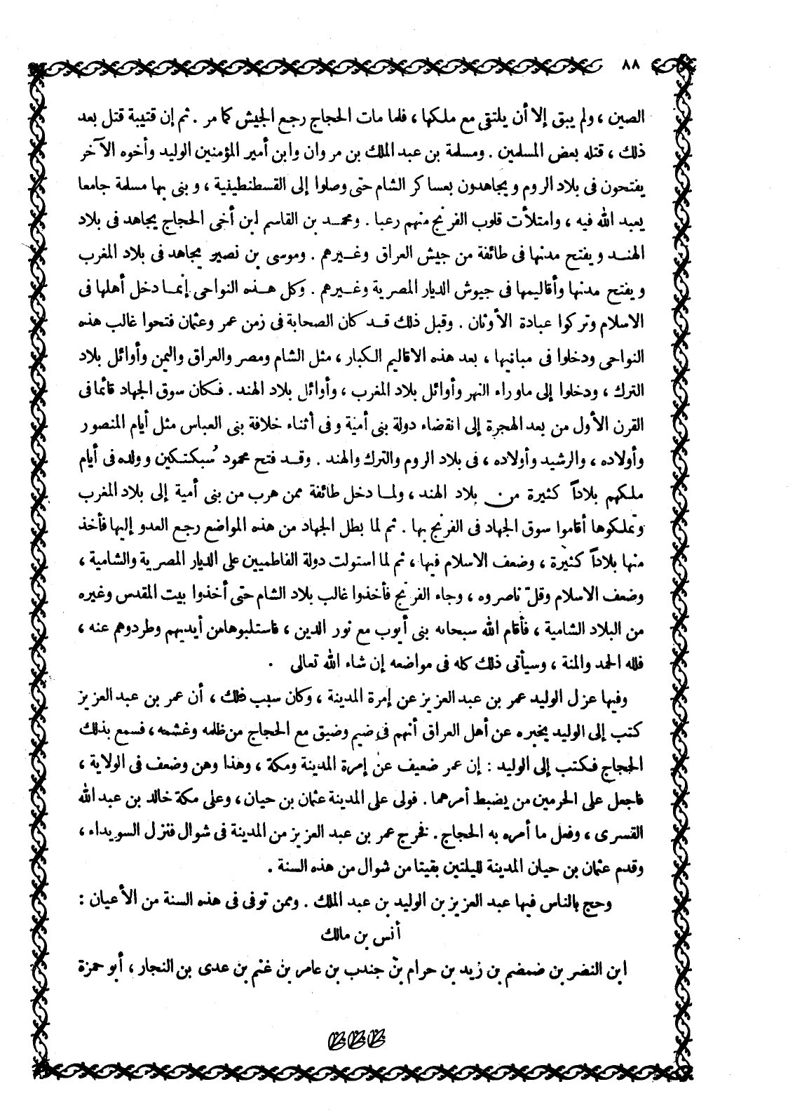 الصين، ولم يبق إلا أن يلتقى مع ملكها، فلما مات الحجاج رجع الجيش كما مر. ثم إن قتيبة قتل بعد ذلك، قتله بعض المسلمين. ومسلمة بن عبد الملك بن مروان وابن أمير المؤمنين الوليد وأخوه الآخر يفتحون في بلاد الروم ويجاهدون بعساكر الشام حتى وصلوا إلى القسطنطينية، وبنى بها مسلمة جامعا يعبد الله فيه، وامتلأت قلوب الفرنج منهم رعبا. ومحمد بن القاسم ابن أخى الحجاج يجاهد في بلاد الهند ويفتح مدنها في طائفة من جيش العراق وغيرهم. وموسى بن نصير يجاهد في بلاد المغرب ويفتح مدنها وأقاليمها في جيوش الديار المصرية وغيرهم. وكل هذه النواحي إنما دخل أهلها في الإسلام وتركوا عبادة الأوثان. وقبل ذلك قد كان الصحابة في زمن عمر وعثمان فتحوا غالب هذه النواحي ودخلوا في مبانيها، بعد هذه الأقاليم الكبار، مثل الشام ومصر والعراق واليمن وأوائل بلاد الترك، ودخلوا إلى ما وراء النهر وأوائل بلاد المغرب، وأوائل بلاد الهند. فكان سوق الجهاد قائما في القرن الأول من بعد الهجرة إلى انقضاء دولة بنى أمية وفي أثناء خلافة بنى العباس مثل أيام المنصور وأولاده، والرشيد وأولاده، في بلاد الروم والترك والهند. وقد فتح محمود سبكتكين وولده في أيام ملكهم بلادا كثيرة من بلاد الهند، ولما دخل طائفة ممن هرب من بنى أمية إلى بلاد المغرب وتملكوها أقاموا سوق الجهاد في الفرنج بها. ثم لما بطل الجهاد من هذه المواضع رجع العدو إليها فأخذ منها بلادا كثيرة، وضعف الإسلام فيها، ثم لما استولت دولة الفاطميين على الديار المصرية والشامية، وضعف الإسلام وقلّ ناصروه، وجاء الفرنج فأخذوا غالب بلاد الشام حتى أخذوا بيت المقدس وغيره من البلاد الشامية، فأقام الله سبحانه بنى أيوب مع نور الدين، فاستلبوها من أيديهم وطردوهم عنه، فلله الحمد والمنة، وسيأتي ذَلِكَ كُلِّهِ فِي مَوَاضِعِهِ إِنْ شَاءَ اللَّهُ تعالى] [1] وَفِيهَا عَزَلَ الْوَلِيدُ عُمَرَ بْنَ عَبْدِ الْعَزِيزِ عَنْ إِمْرَةِ الْمَدِينَةِ، وَكَانَ سَبَبُ ذَلِكَ، أَنَّ عُمَرَ بْنَ عَبْدِ الْعَزِيزِ كَتَبَ إِلَى الْوَلِيدِ يُخْبِرُهُ عَنْ أَهْلِ الْعِرَاقِ أَنَّهُمْ فِي ضَيْمٍ وَضِيقٍ مَعَ الْحَجَّاجِ مِنْ ظُلْمِهِ وَغَشْمِهِ، فَسَمِعَ بِذَلِكَ الْحَجَّاجُ فَكَتَبَ إِلَى الْوَلِيدِ: إِنَّ عُمَرَ ضعيف عن إمرة الْمَدِينَةِ وَمَكَّةَ، وَهَذَا وَهْنٌ وَضَعْفٌ فِي الْوِلَايَةِ، فاجعل على الحرمين من يضبط أمرهما. فولى عَلَى الْمَدِينَةِ عُثْمَانَ بْنَ حَيَّانَ، وَعَلَى مَكَّةَ خالد بن عبد الله القسري، وفعل مَا أَمَرَهُ بِهِ الْحَجَّاجُ. فَخَرَجَ عُمَرُ بْنُ عَبْدِ الْعَزِيزِ مِنَ الْمَدِينَةِ فِي شَوَّالٍ فَنَزَلَ السُّوَيْدَاءَ، وَقَدِمَ عُثْمَانُ بْنُ حَيَّانَ الْمَدِينَةَ لِلَيْلَتَيْنِ بَقِيَتَا مِنْ شَوَّالٍ مِنْ هَذِهِ السَّنَةِ.