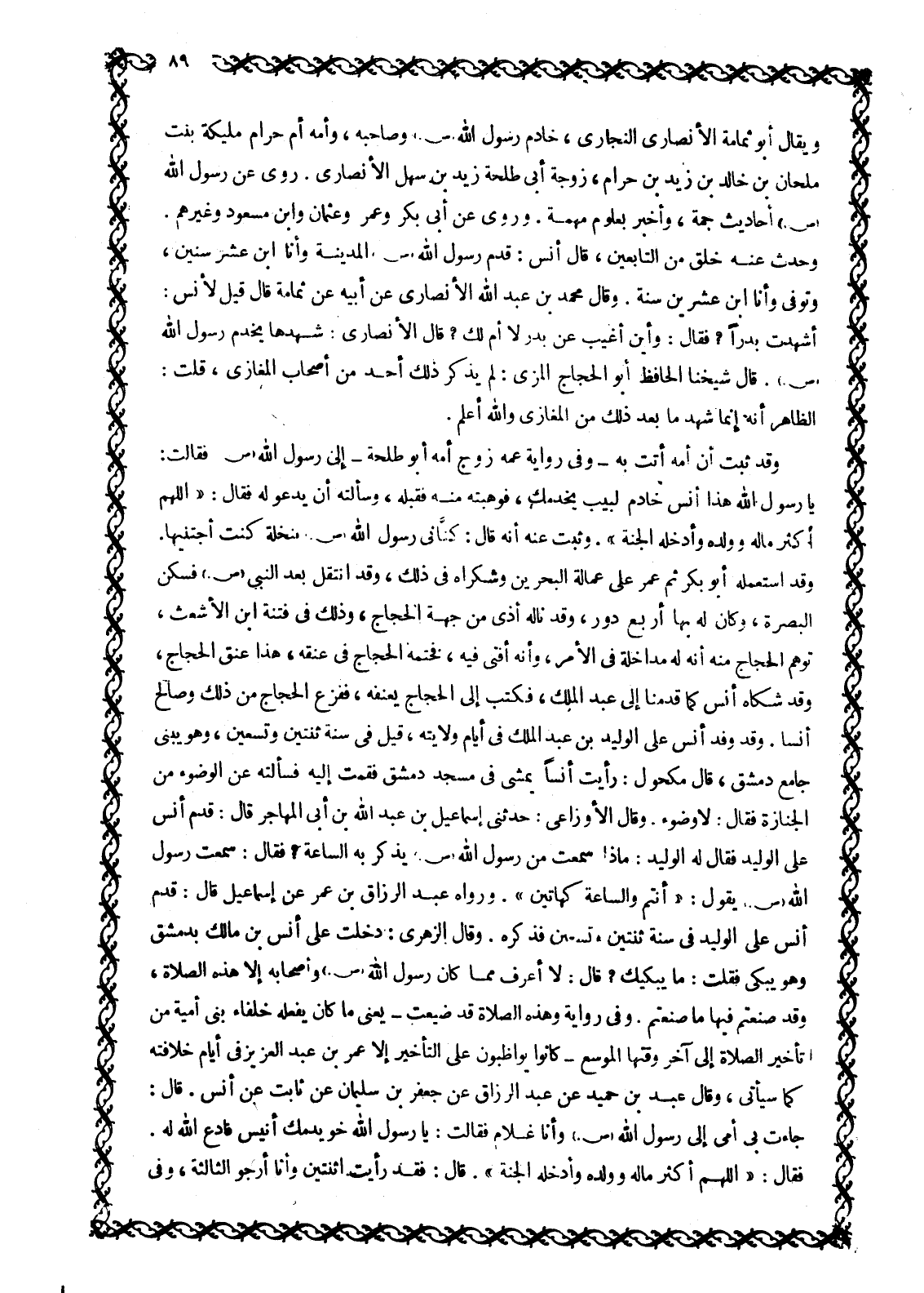 وَيُقَالُ أَبُو ثُمَامَةَ الْأَنْصَارِيُّ النَّجَّارِيُّ، خَادِمُ رَسُولِ اللَّهِ صَلَّى اللَّهُ عَلَيْهِ وَسَلَّمَ وَصَاحِبُهُ، وَأُمُّهُ أُمُّ حَرَامٍ مُلَيْكَةُ بِنْتُ مِلْحَانَ بْنِ خَالِدِ بْنِ زَيْدِ بْنِ حَرَامٍ، زَوْجَةُ أَبِي طَلْحَةَ زَيْدِ بْنِ سَهْلٍ الْأَنْصَارِيِّ. رَوَى عَنْ رَسُولِ اللَّهِ صَلَّى اللَّهُ عَلَيْهِ وَسَلَّمَ أَحَادِيثَ جَمَّةً، وَأَخْبَرَ بِعُلُومٍ مُهِمَّةٍ. وَرَوَى عَنْ أَبِي بَكْرٍ وَعُمَرَ وَعُثْمَانَ وَابْنِ مَسْعُودٍ وَغَيْرِهِمْ.