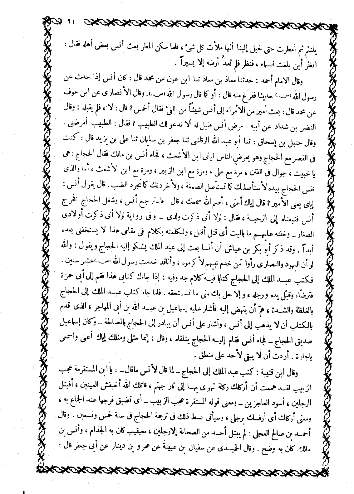 وَقَالَ الْإِمَامُ أَحْمَدُ: حَدَّثَنَا مُعَاذُ بْنُ مُعَاذٍ ثَنَا ابْنُ عَوْنٍ عَنْ مُحَمَّدٍ قَالَ: كَانَ أَنَسٌ إِذَا حَدَّثَ عَنْ رَسُولِ اللَّهِ صَلَّى اللَّهُ عَلَيْهِ وَسَلَّمَ حدثنا فَفَرَغَ مِنْهُ قَالَ: أَوْ كَمَا قَالَ رَسُولُ اللَّهِ صَلَّى اللَّهُ عَلَيْهِ وَسَلَّمَ. وَقَالَ الْأَنْصَارِيُّ عن ابن عوف عَنْ مُحَمَّدٍ قَالَ: بَعَثَ أَمِيرٌ مِنَ الْأُمَرَاءِ إِلَى أَنَسٍ شَيْئًا مِنَ الْفَيْءِ فَقَالَ أَخُمُسٌ؟ قَالَ: لَا، فَلَمْ يَقْبَلْهُ: وَقَالَ النَّضِرُ بْنُ شَدَّادٍ عَنْ أَبِيهِ: مَرِضَ أَنَسٌ فَقِيلَ لَهُ أَلَا نَدْعُو لَكَ الطَّبِيبَ؟ فَقَالَ: الطَّبِيبُ أَمْرَضَنِي.