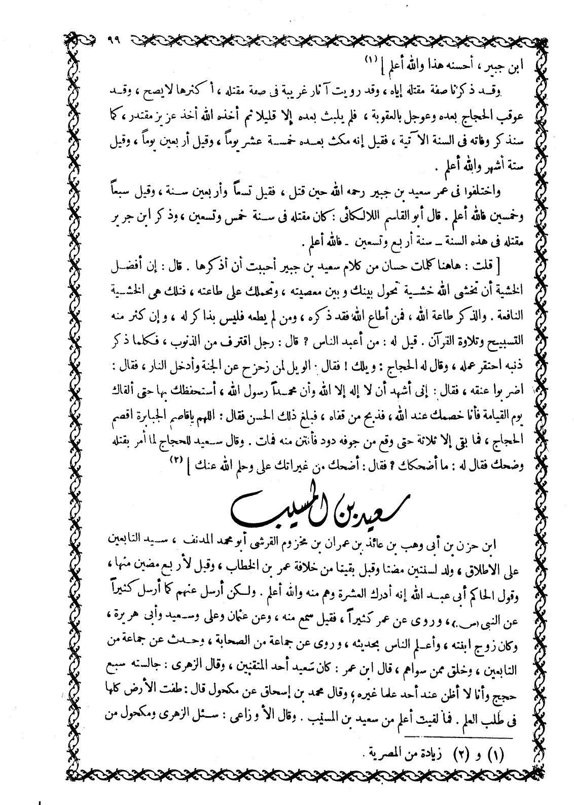 [قلت: هاهنا كلمات حسان من كلام سعيد بن جبير أحببت أن أذكرها. قال: إن أفضل الخشبة أن تخشى الله خشية تحول بينك وبين معصيته، وتحملك على طاعته، فتلك هي الخشية النافعة. والذكر طاعة الله، فمن أطاع الله فقد ذكره، ومن لم يطعه فليس بذاكر له، وإن كثر منه التسبيح وتلاوة القرآن. قيل له: من أعبد الناس؟ قال: رجل اقترف من الذنوب، فكلما ذكر ذنبه احتقر عمله، وقال له الحجاج: ويلك! فقال: الويل لمن زحزح عن الجنة وأدخل النار، فقال: