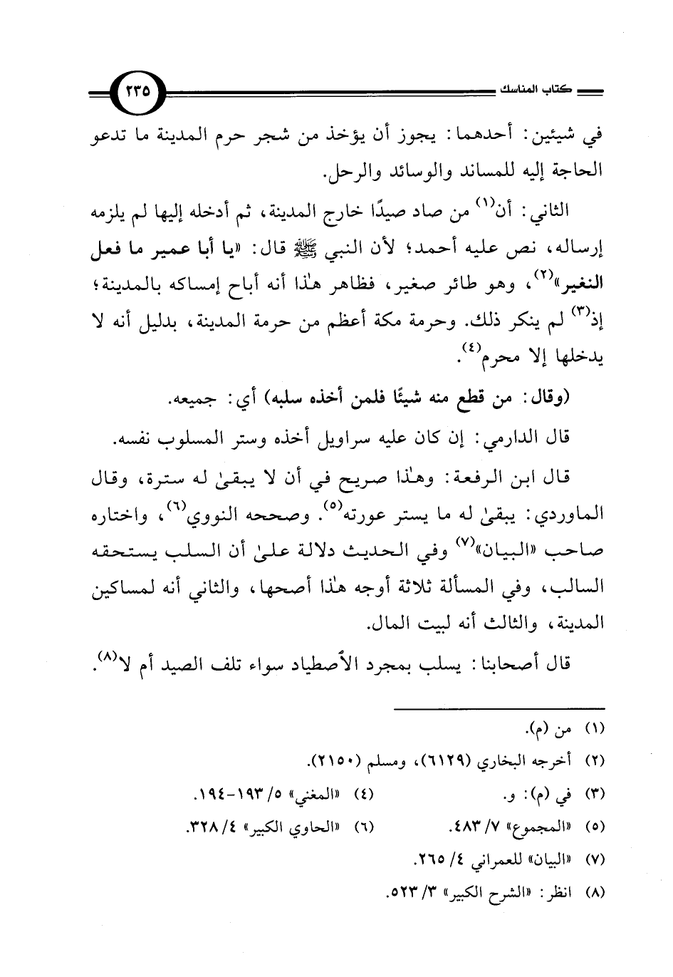 الثاني: أن (¬1) من صاد صيدًا خارج المدينة، ثم أدخله إليها لم يلزمه إرساله، نص عليه أحمد؛ لأن النبي - صلى الله عليه وسلم - قال: "يا أبا عمير ما فعل النغير" (¬2)، وهو طائر صغير، فظاهر هذا أنه أباح إمساكه بالمدينة؛ إذ (¬3) لم ينكر ذلك. وحرمة مكة أعظم من حرمة المدينة، بدليل أنه لا يدخلها إلا محرم (¬4).