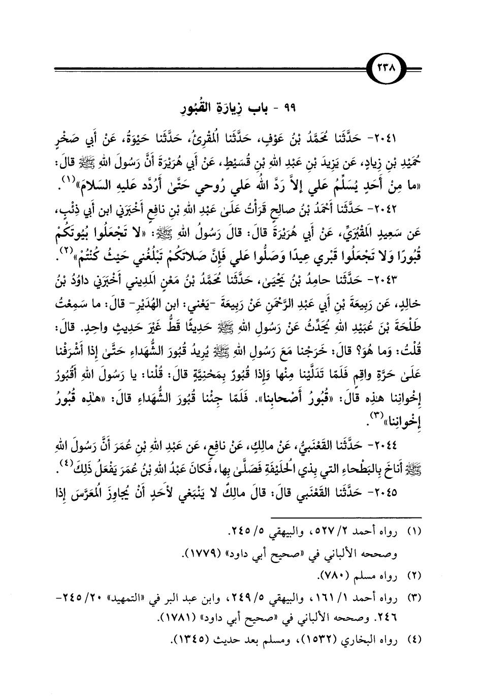 2042 - حَدَّثَنا أَحْمَدُ بْنُ صالِحٍ قَرَأْتُ عَلَى عَبْدِ اللهِ بْنِ نافِعٍ أَخْبَرَني ابن أَبي ذِئْبٍ، عَن سَعِيدٍ المَقْبُرَيِّ، عَنْ أَبي هُرَيْرَةَ قَالَ: قَالَ رَسُولُ اللهِ - صلى الله عليه وسلم -: "لا تَجْعَلُوا بُيُوتَكُمْ قُبُورًا وَلا تَجْعَلُوا قَبْري عِيدًا وَصَلُّوا عَلي فَإِنَّ صَلَاتَكُمْ تَبْلُغُني حَيْثُ كُنْتُمْ" (¬2).