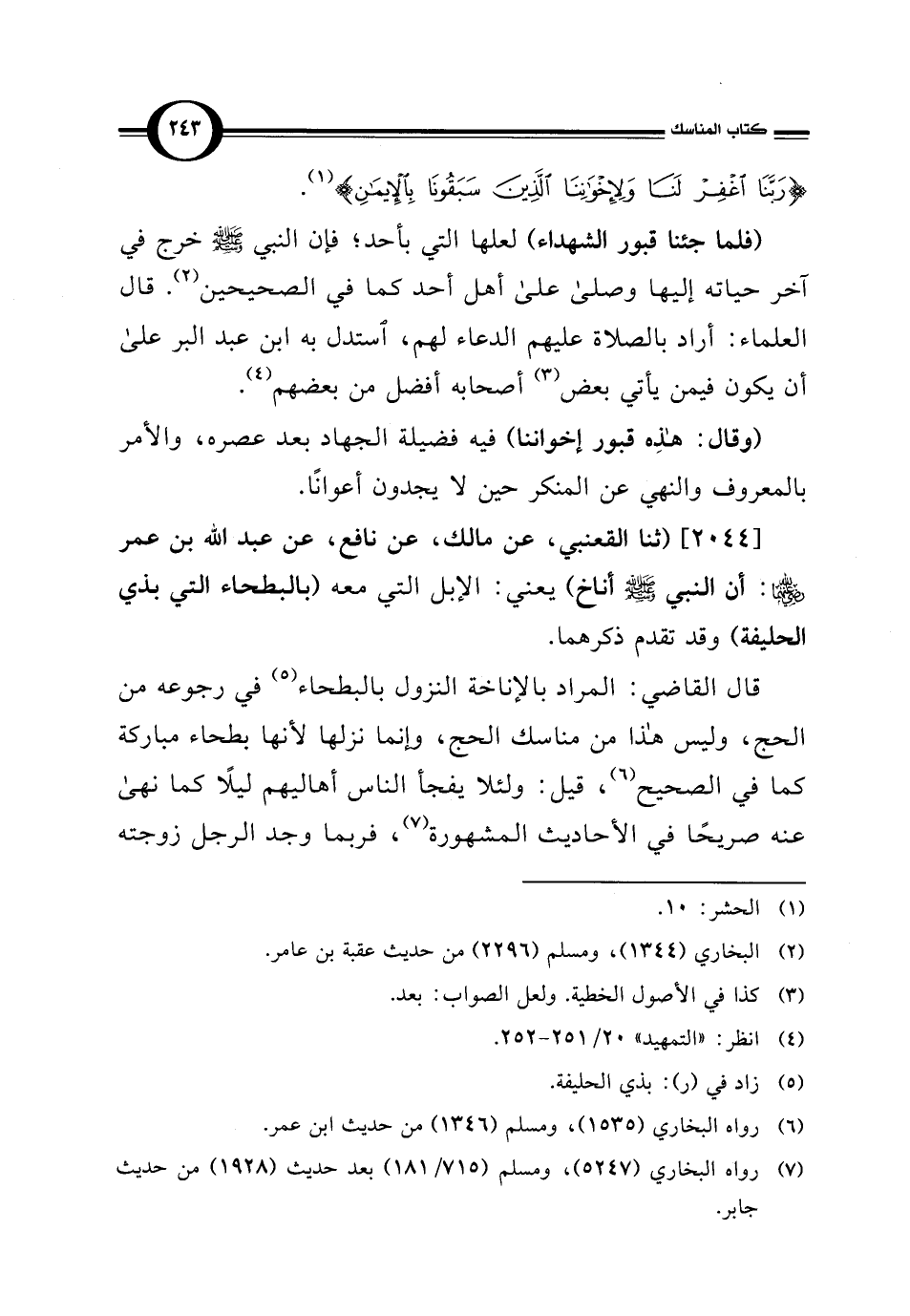 [2044] (ثنا القعنبي، عن مالك، عن نافع، عن عبد الله بن عمر - رضي الله عنهما -: أن النبي - صلى الله عليه وسلم - أناخ) يعني: الإبل التي معه (بالبطحاء التي بذي الحليفة) وقد تقدم ذكرهما.