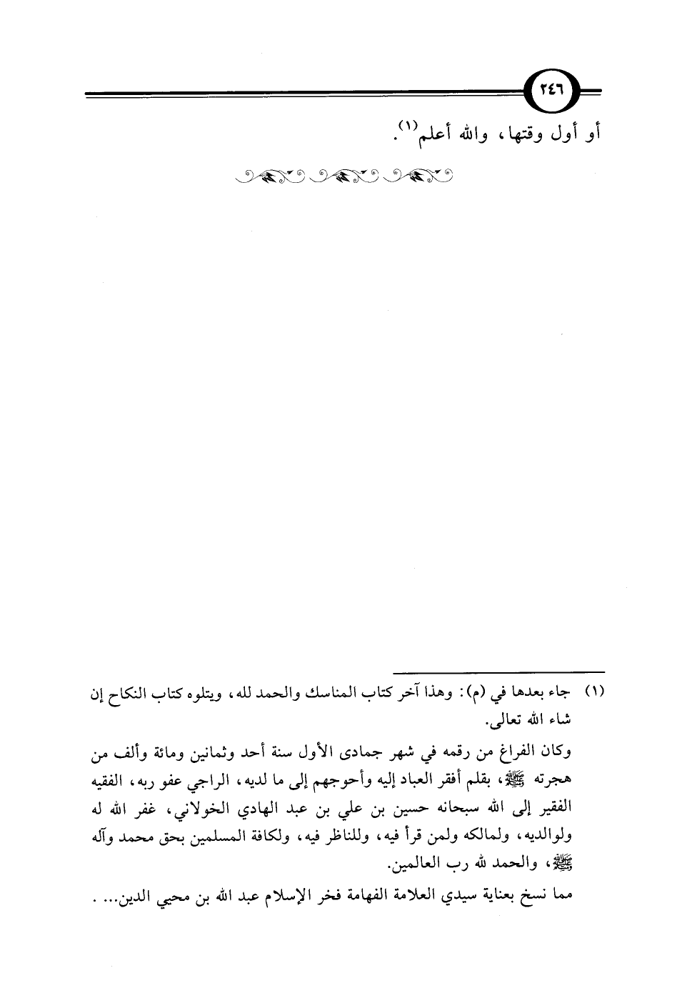 وكان الفراغ من رقمه في شهر جمادى الأول سنة أحد وثمانين ومائة وألف من هجرته - صلى الله عليه وسلم -، بقلم أفقر العباد إليه وأحوجهم إلى ما لديه، الراجي عفو ربه، الفقيه الفقير إلى الله سبحانه حسين بن علي بن عبد الهادي الخولاني، غفر الله له ولوالديه، ولمالكه ولمن قرأ فيه، وللناظر فيه، ولكافة المسلمين بحق محمد وآله - صلى الله عليه وسلم -، والحمد لله رب العالمين.