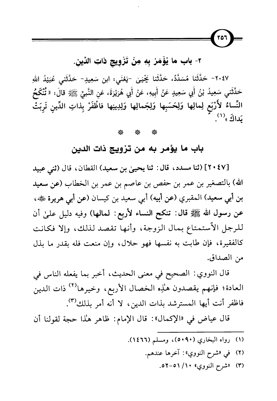 2047 - حَدَّثَنا مُسَدَّدٌ، حَدَّثَنا يَحْيَى - يَعْنَي: ابن سَعِيدٍ - حَدَّثَني عُبَيْدُ اللهِ حَدَّثَني سَعِيدُ بْنُ أَبي سَعِيدٍ عَنْ أَبِيهِ، عَنْ أَبي هُرَيْرَةَ، عَنِ النَّبيِّ - صلى الله عليه وسلم - قَالَ: "تُنْكَحُ النِّساءُ لأَرْبَعٍ لِمالِها وَلحَسَبِها وَلِجَمالِها وَلدِينِها فاظْفَرْ بِذاتِ الدِّينِ تَرِبَتْ يَداكَ" (¬1).