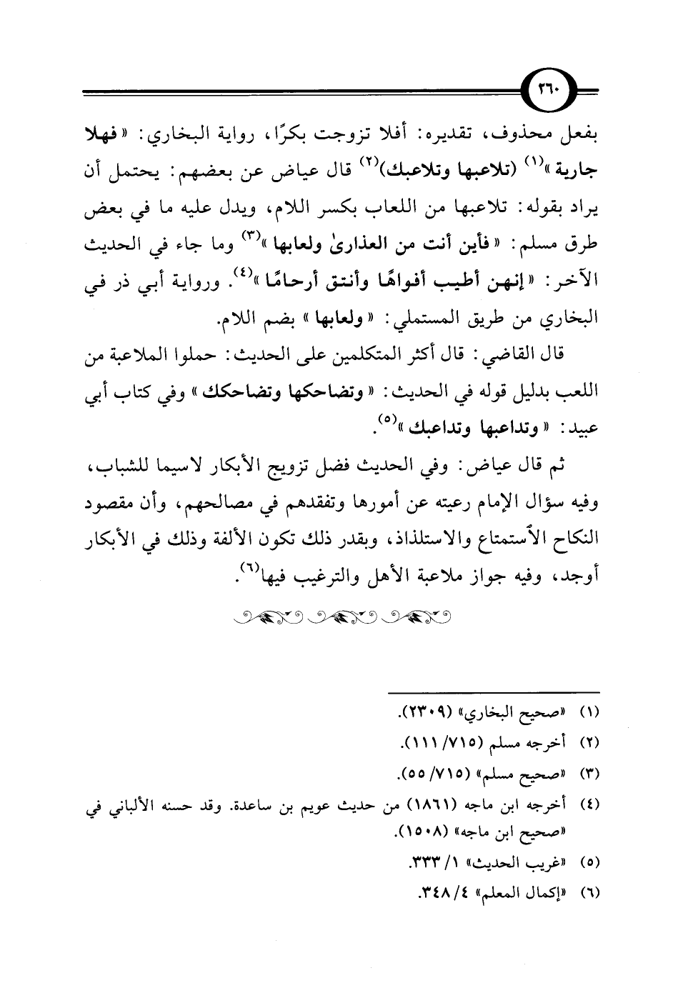 قال القاضي: قال أكثر المتكلمين على الحديث: حملوا الملاعبة من اللعب بدليل قوله في الحديث: "وتضاحكها وتضاحكك" وفي كتاب أبي عبيد: "وتداعبها وتداعبك" (¬5).