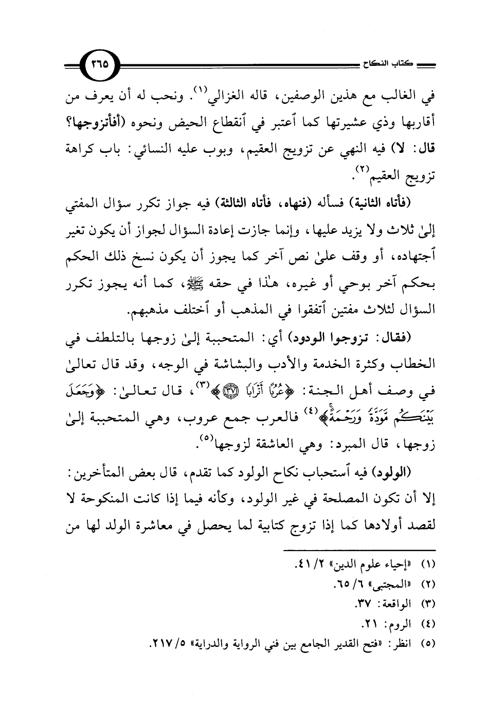 (فقال: تزوجوا الودود) أي: المتحببة إلى زوجها بالتلطف في الخطاب وكثرة الخدمة والأدب والبشاشة في الوجه، وقد قال تعالى في وصف أهل الجنة: {عُرُبًا أَتْرَابًا (37)} (¬3)، قال تعالى: {وَجَعَلَ بَيْنَكُمْ مَوَدَّةً وَرَحْمَةً} (¬4) فالعرب جمع عروب، وهي المتحببة إلى زوجها، قال المبرد: وهي العاشقة لزوجها (¬5).