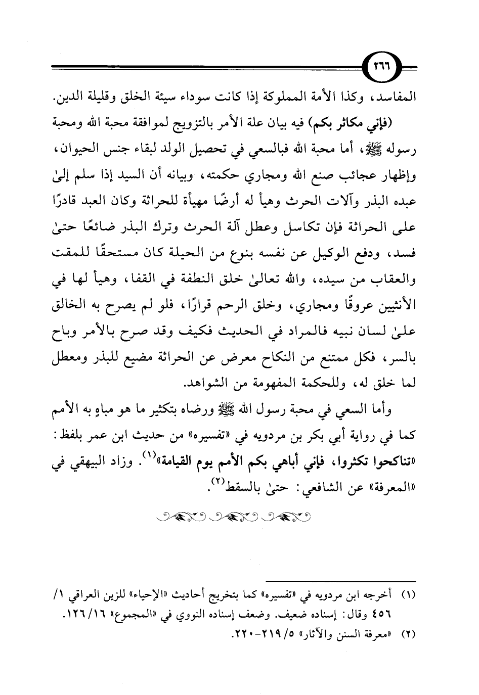 وأما السعي في محبة رسول الله - صلى الله عليه وسلم - ورضاه بتكثير ما هو مباهٍ به الأمم كما في رواية أبي بكر بن مردويه في "تفسيره" من حديث ابن عمر بلفظ: "تناكحوا تكثروا، فإني أباهي بكم الأمم يوم القيامة" (¬1). وزاد البيهقي في "المعرفة" عن الشافعي: حتى بالسقط (¬2).