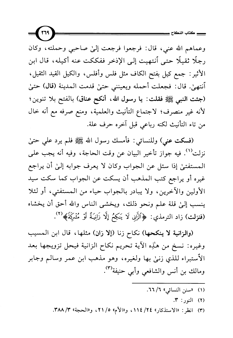 (فسكت عني) وللنسائي: فأمسك رسول الله - صلى الله عليه وسلم - فلم يرد علي حتى نزلت (¬1). فيه جواز تأخير البيان عن وقت الحاجة، وفيه أنه يجب على المستفتى إذا سئل عن الجواب وكان لا يعرف جوابه إلى أن يراجع غيره أو يراجع كتب المذهب أن يسكت عن الجواب كما سكت سيد الأولين والآخرين، ولا يبادر بالجواب حياء من المستفتي، أو لئلا ينسب إلى قلة علم ونحو ذلك، ويخشى الناس والله أحق أن يخشاه (فنزلت) زاد الترمذي: {الزَّانِي لَا يَنْكِحُ إِلَّا زَانِيَةً أَوْ مُشْرِكَةً} (¬2).