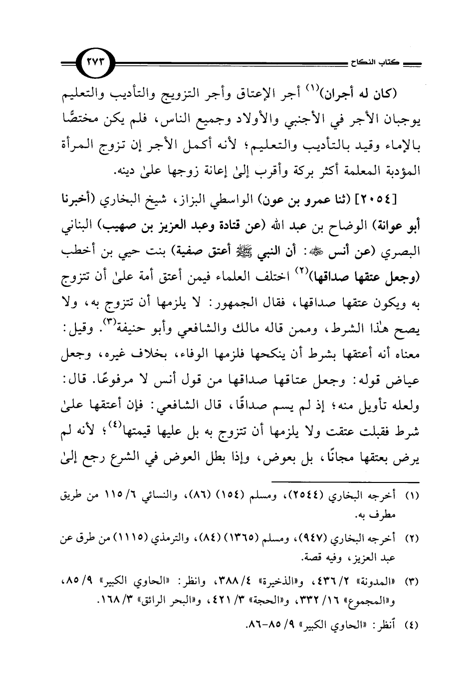 [2054] (ثنا عمرو بن عون) الواسطي البزاز، شيخ البخاري (أخبرنا أبو عوانة) الوضاح بن عبد الله (عن قتادة وعبد العزيز بن صهيب) البناني البصري (عن أنس - رضي الله عنه -: أن النبي - صلى الله عليه وسلم - أعتق صفية) بنت حيي بن أخطب (وجعل عتقها صداقها) (¬2) اختلف العلماء فيمن أعتق أمة على أن تتزوج به ويكون عتقها صداقها، فقال الجمهور: لا يلزمها أن تتزوج به، ولا يصح هذا الشرط، وممن قاله مالك والشافعي وأبو حنيفة (¬3). وقيل: معناه أنه أعتقها بشرط أن ينكحها فلزمها الوفاء، بخلاف غيره، وجعل عياض قوله: وجعل عتاقها صداقها من قول أنس لا مرفوعًا. قال: ولعله تأويل منه؛ إذ لم يسم صداقًا، قال الشافعي: فإن أعتقها على شرط فقبلت عتقت ولا يلزمها أن تتزوج به بل عليها قيمتها (¬4)؛ لأنه لم يرض بعتقها مجانًا، بل بعوض، وإذا بطل العوض في الشرع رجع إلى