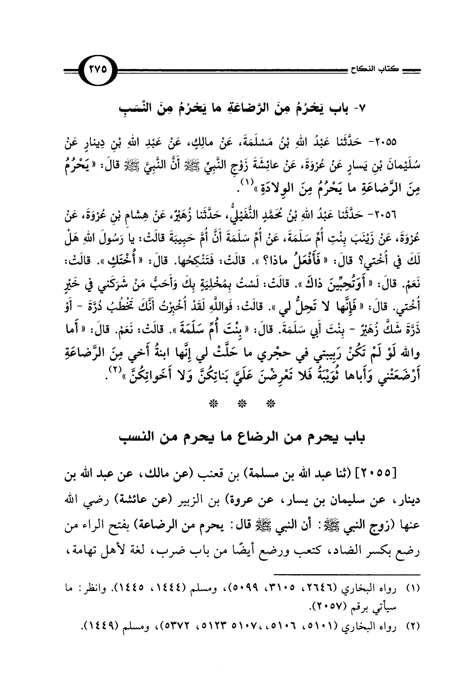 2055 - حَدَّثَنا عَبْدُ اللهِ بْنُ مَسْلَمَةَ، عَنْ مالِكٍ، عَنْ عَبْدِ اللهِ بْنِ دِينارٍ عَنْ سُلَيمانَ بْنِ يَسارٍ عَنْ عُرْوَةَ، عَنْ عَائِشَةَ زَوْجِ النَّبِيِّ - صلى الله عليه وسلم - أَنَّ النَّبِيَّ - صلى الله عليه وسلم - قَالَ: "يَحْرُمُ مِنَ الرَّضاعَةِ ما يَحْرُمُ مِنَ الوِلادَةِ" (¬1).