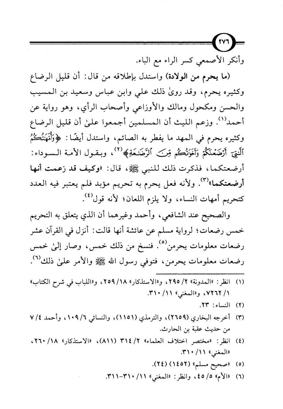 (ما يحرم من الولادة) واستدل بإطلاقه من قال: أن قليل الرضاع وكثيره يحرم، وقد روى ذلك علي وابن عباس وسعيد بن المسيب والحسن ومكحول ومالك والأوزاعي وأصحاب الرأي، وهو رواية عن أحمد (¬1). وزعم الليث أن المسلمين أجمعوا على أن قليل الرضاع وكثيره يحرم في المهد ما يفطر به الصائم، واستدل أيضًا: {وَأُمَّهَاتُكُمُ اللَّاتِي أَرْضَعْنَكُمْ وَأَخَوَاتُكُمْ مِنَ الرَّضَاعَةِ} (¬2)، وبقول الأمة السوداء: أرضعتكما، فذكرت ذلك للنبي - صلى الله عليه وسلم -، قال: "وكيف قد زعمت أنها أرضعتكما" (¬3). ولأنه فعل يحرم به تحريم مؤبد فلم يعتبر فيه العدد كتحريم أمهات النساء، ولا يلزم اللعان؛ لأنه قول (¬4).
