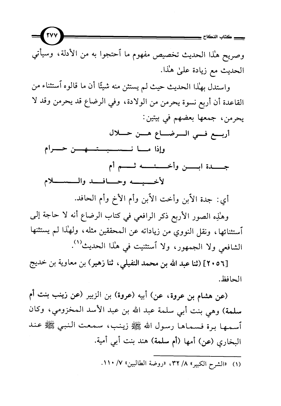 واستدل بهذا الحديث حيث لم يستثن منه شيئًا أن ما قالوه استثناء من القاعدة أن أربع نسوة يحرمن من الولادة، وفي الرضاع قد يحرمن وقد لا يحرمن، جمعها بعضهم في بيتين: