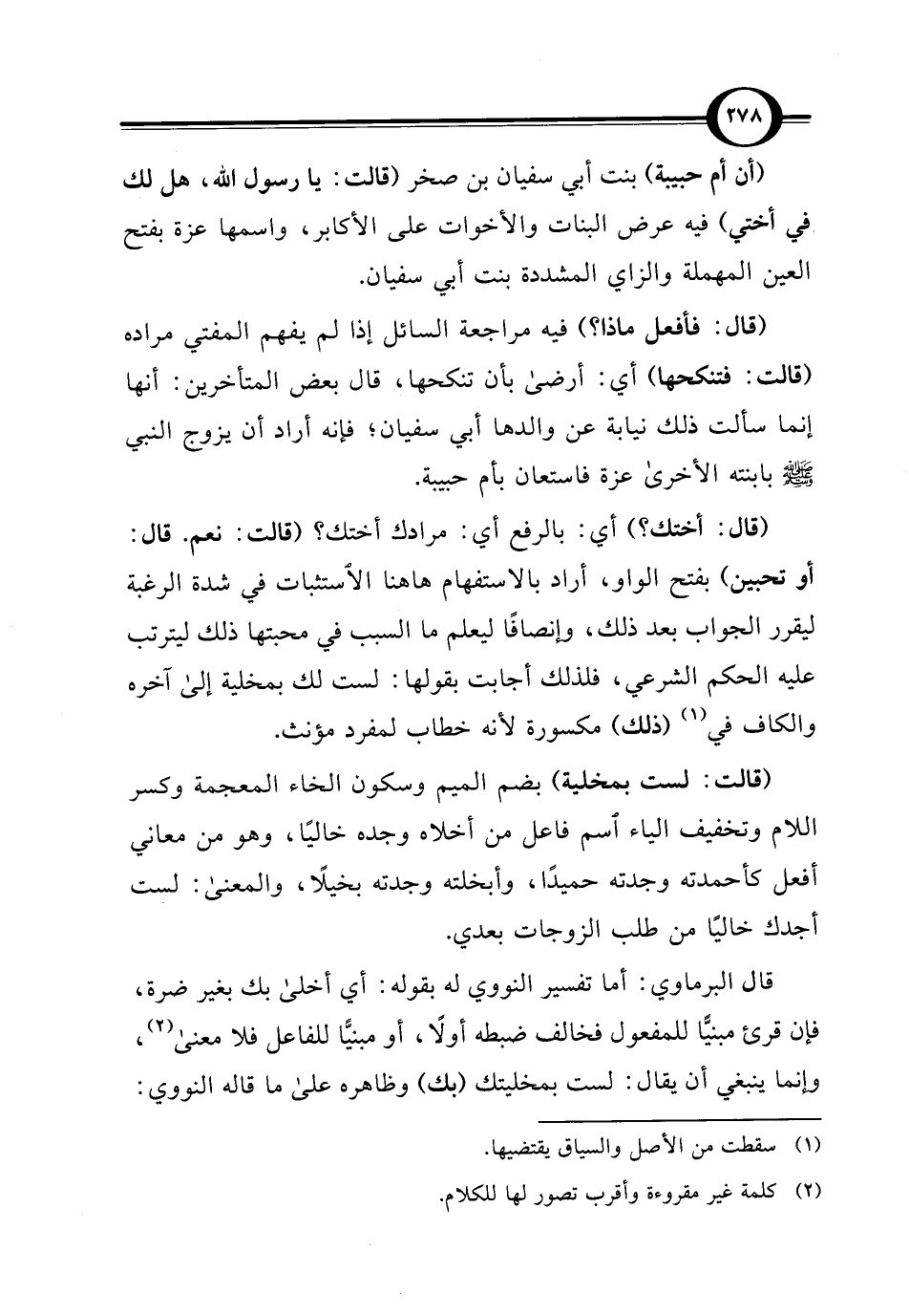 قال البرماوي: أما تفسير النووي له بقوله: أي أخلى بك بغير ضرة، فإن قرئ مبنيًّا للمفعول فخالف ضبطه أولًا، أو مبنيًّا للفاعل فلا معنى (¬2)، وإنما ينبغي أن يقال: لست بمخليتك (بك) وظاهره على ما قاله النووي:
