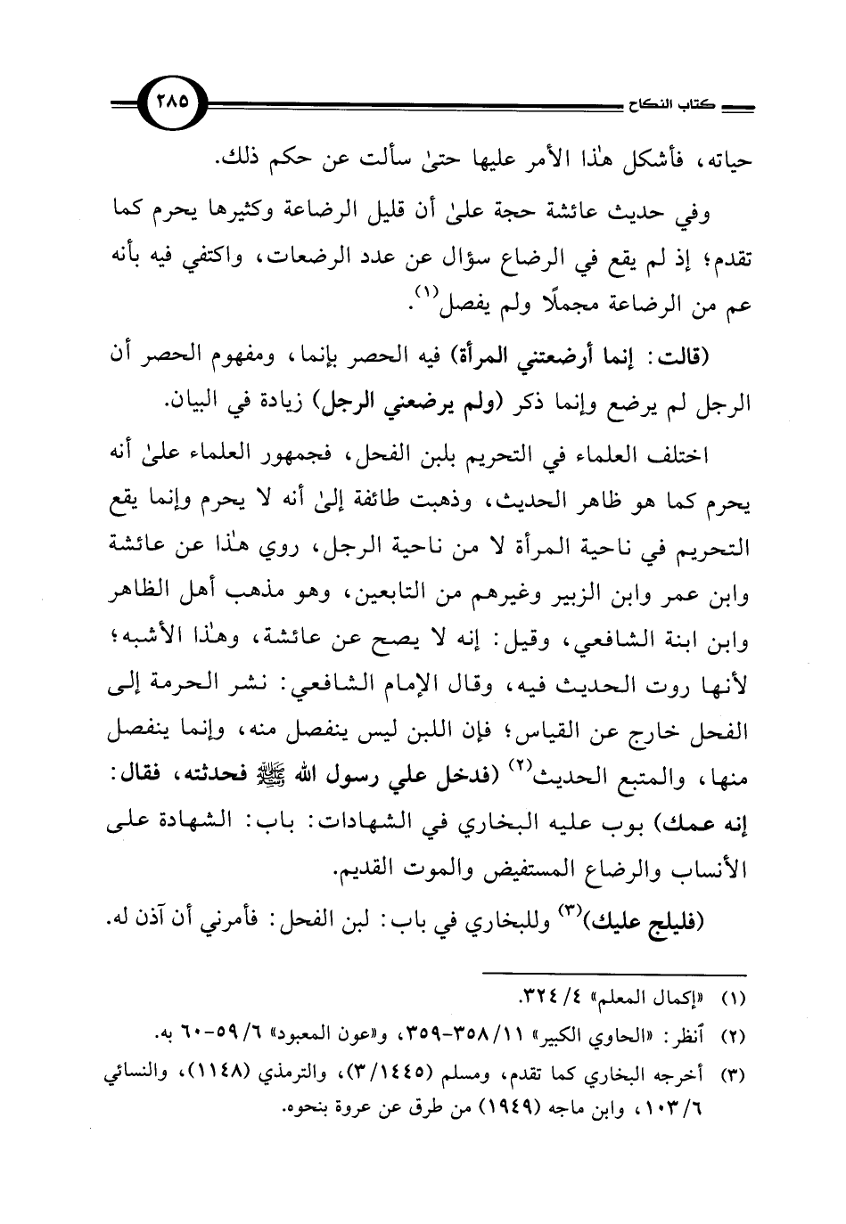 اختلف العلماء في التحريم بلبن الفحل، فجمهور العلماء على أنه يحرم كما هو ظاهر الحديث، وذهبت طائفة إلى أنه لا يحرم وإنما يقع التحريم في ناحية المرأة لا من ناحية الرجل، روي هذا عن عائشة وابن عمر وابن الزبير وغيرهم من التابعين، وهو مذهب أهل الظاهر وابن ابنة الشافعي، وقيل: إنه لا يصح عن عائشة، وهذا الأشبه؛ لأنها روت الحديث فيه، وقال الإمام الشافعي: نشر الحرمة إلى الفحل خارج عن القياس؛ فإن اللبن ليس ينفصل منه، وإنما ينفصل منها، والمتبع الحديث (¬2) (فدخل علي رسول الله - صلى الله عليه وسلم - فحدثته، فقال: إنه عمك) بوب عليه البخاري في الشهادات: باب: الشهادة على الأنساب والرضاع المستفيض والموت القديم.